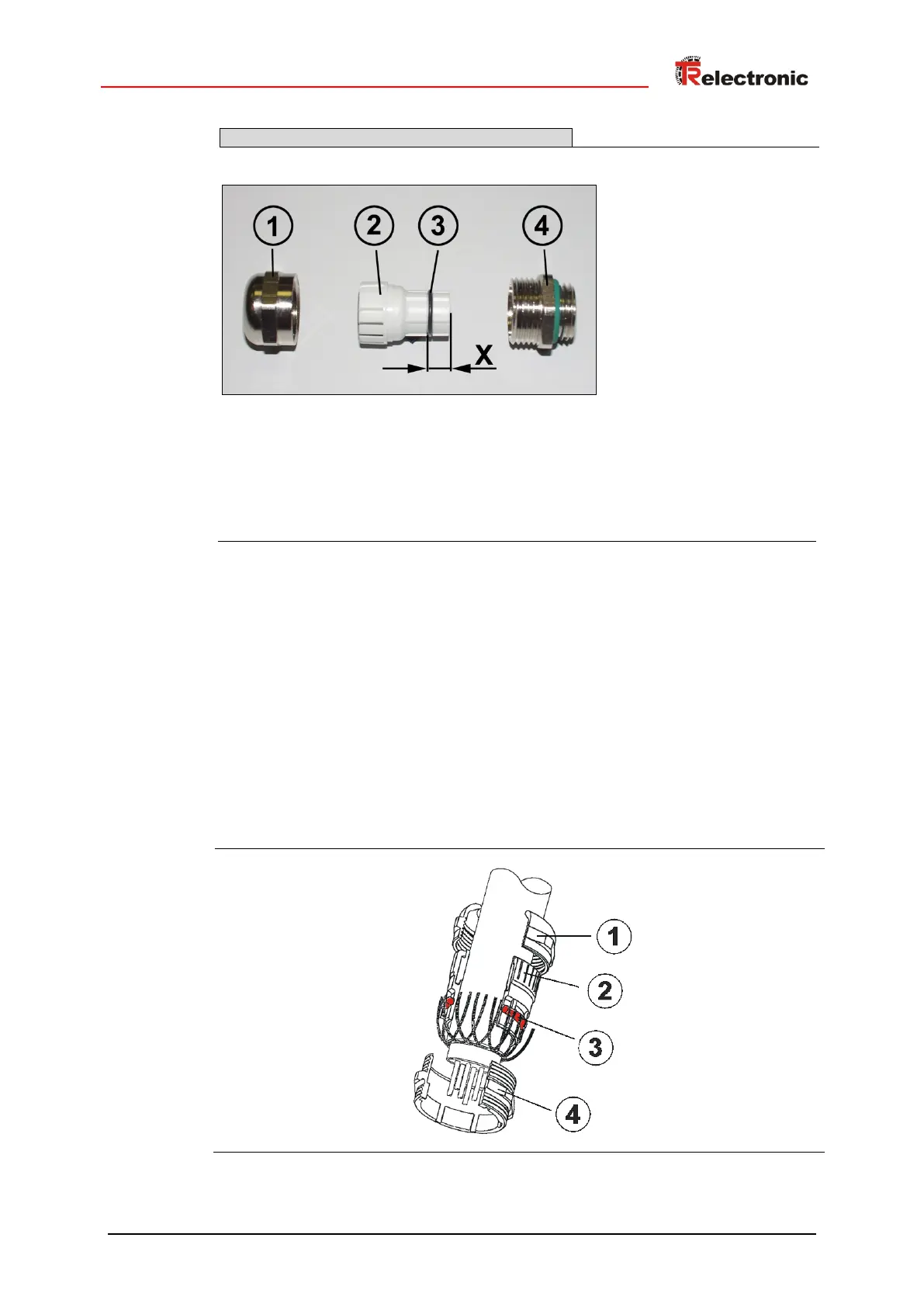 2. Überwurfmutter (1) und Klemmeneinsatz (2) auf das Kabel aufschieben.