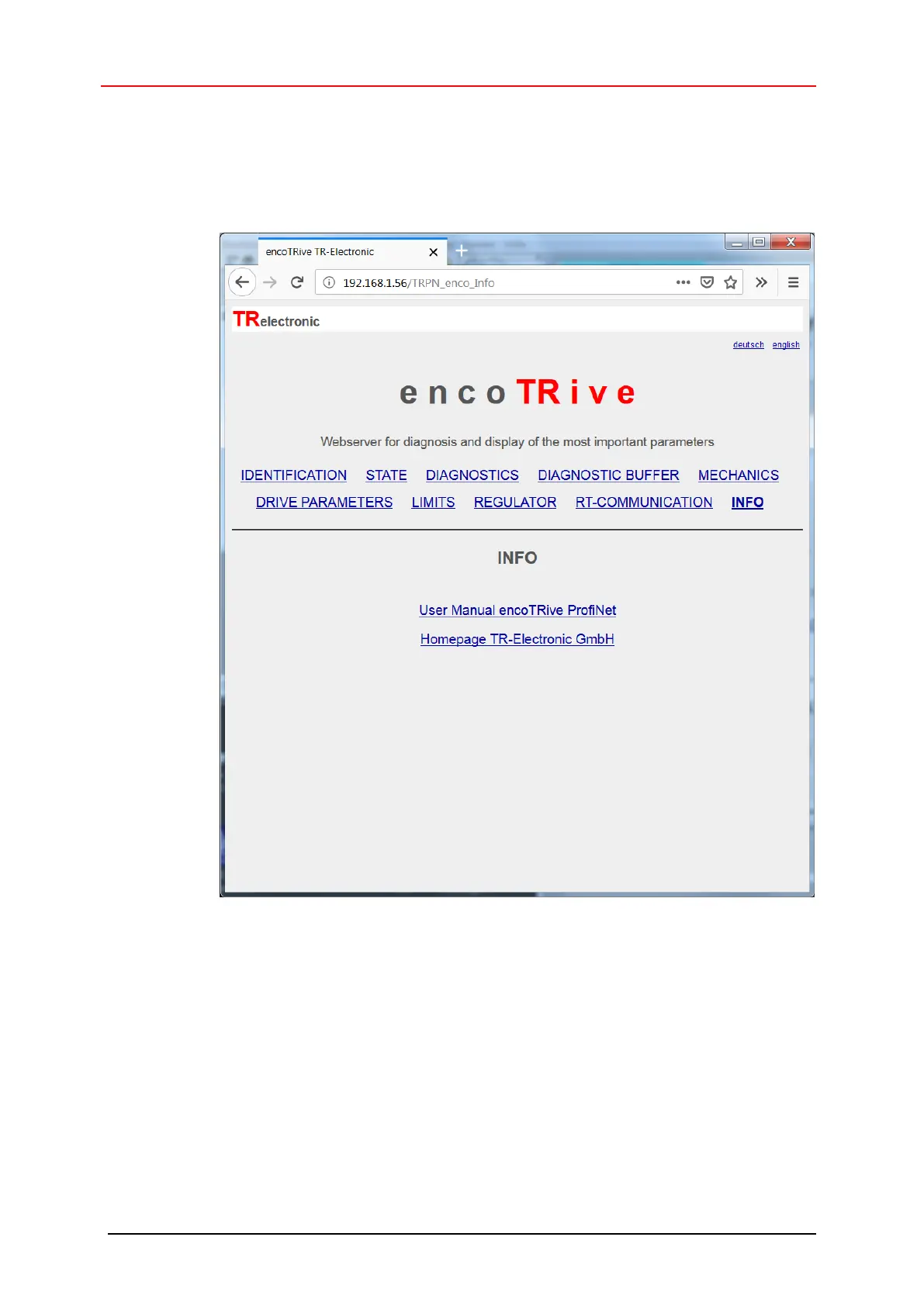 The INFO web page contains links to this user manual and to the TR-Electronic