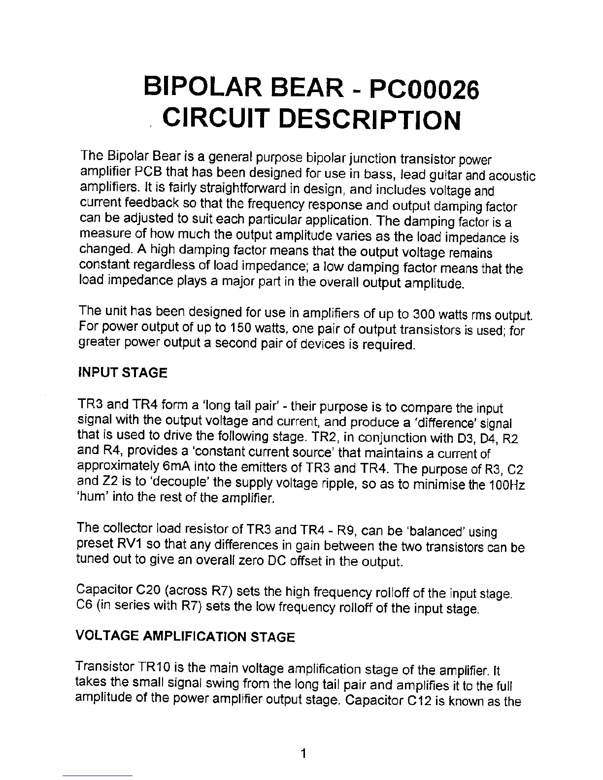 TRACE ELLIOT V-TYPE - Trace Elliot Bipolar Bear Output Stage Circuit Description; Bipolar Bear Input Stage Operation; Bipolar Bear Voltage Amplification Stage