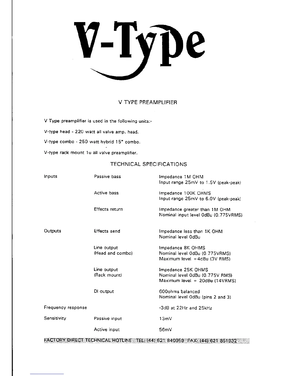 TRACE ELLIOT V-TYPE - Trace Elliot V-Type Preamplifier Specifications; V-Type Preamplifier Input Specifications; V-Type Preamplifier Output Specifications; V-Type Frequency Response