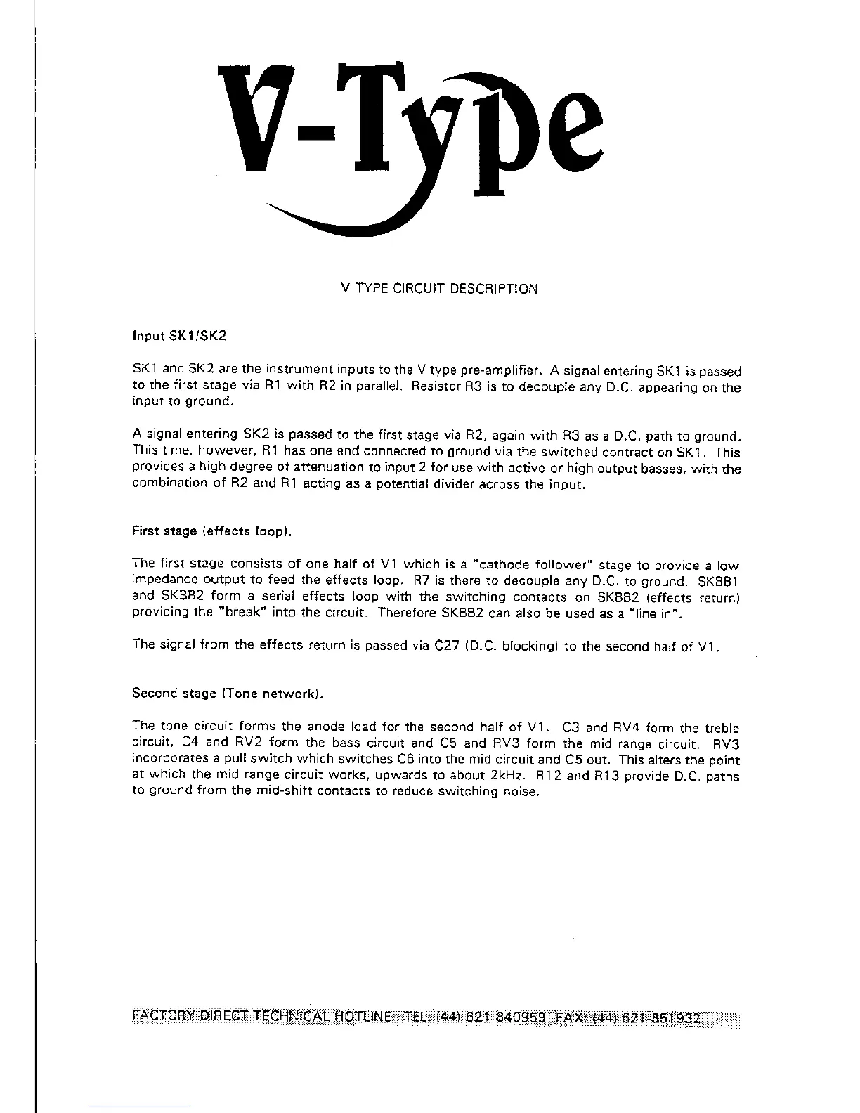 TRACE ELLIOT V-TYPE - Trace Elliot V-Type Circuit Description; V-Type Input Stage Circuitry; V-Type First Stage & Effects Loop; V-Type Tone Network Circuit