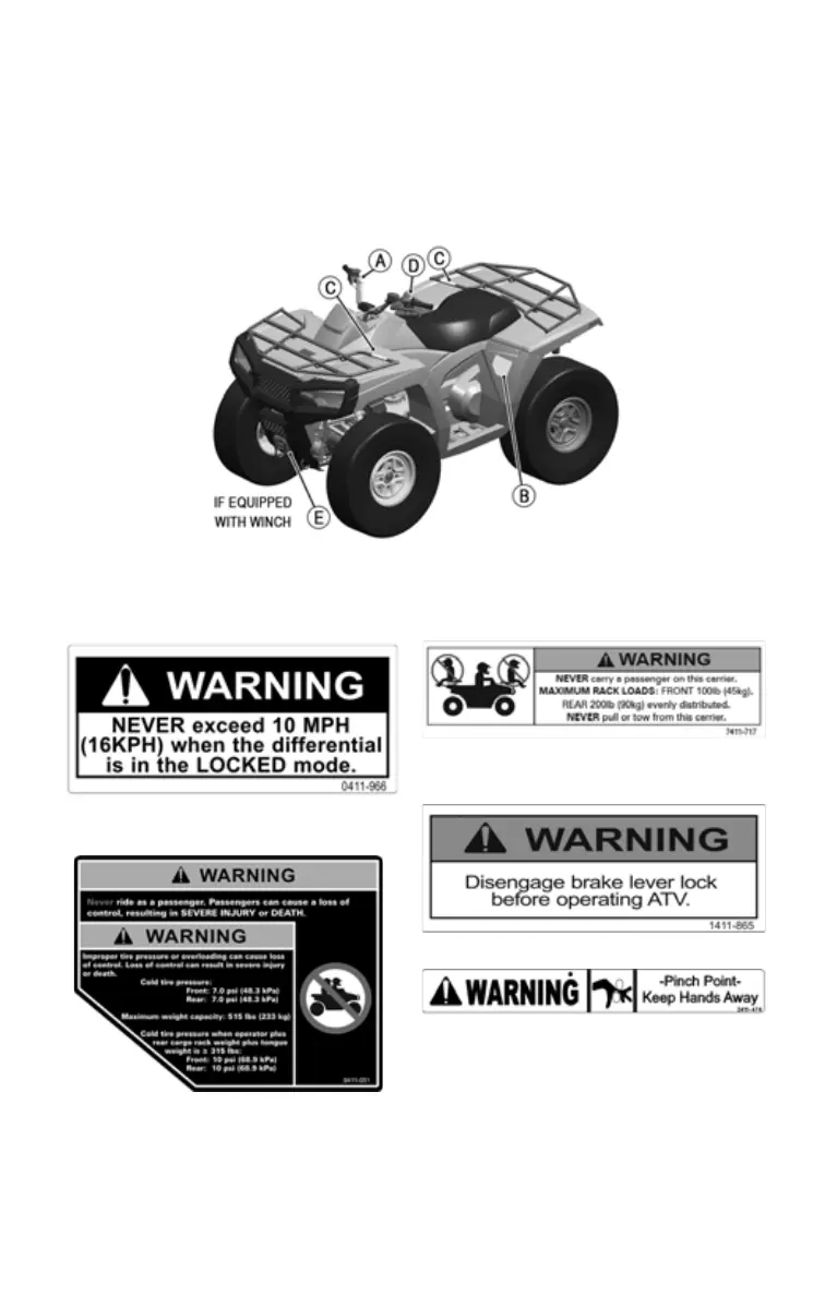 should be considered as permanent parts of the ATV. If a label comes off or becomes hard