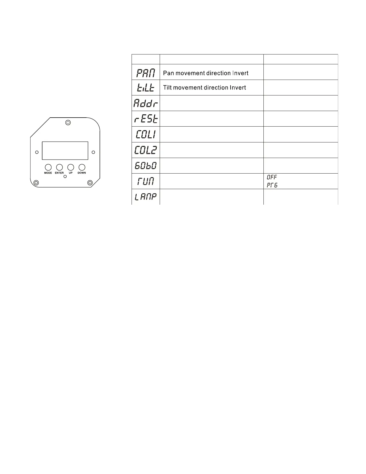 Use the fixture’s Control Panel to access the Control Menu. The MODE Key moves between