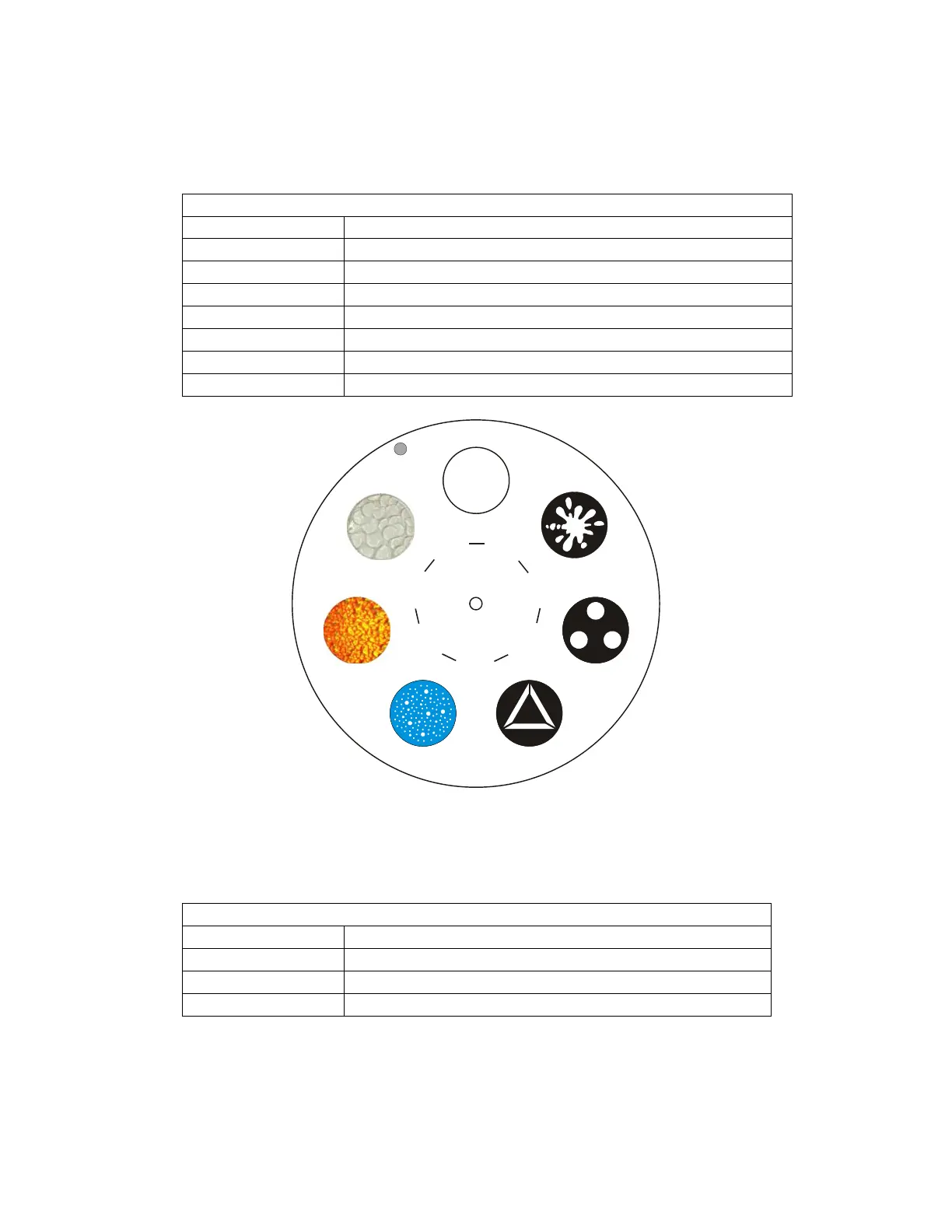 The Rotating Gobo Wheel contains 6 replaceable gobos, 3 metal and 3 glass. The Gobo