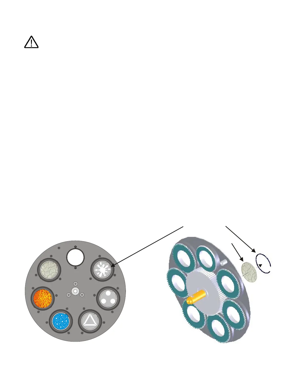 Care must be used when removing and replacing individual rotating gobos. Take precautions