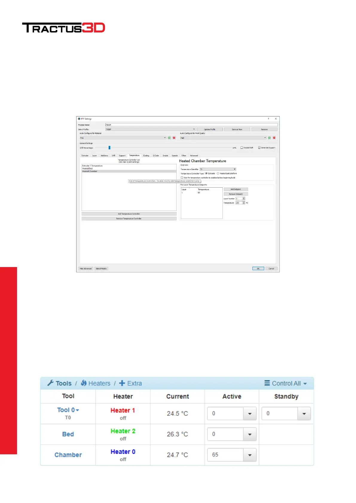 With the Tractus T850P 3d printer there is an option to heat up the build chamber. The air temperature around