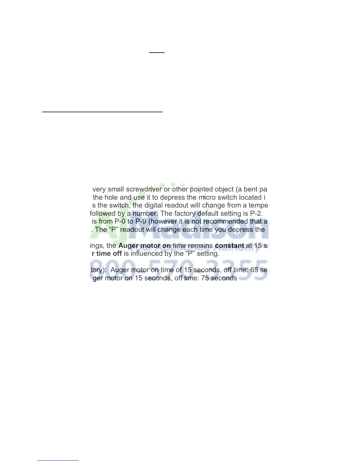 P-2 Setting (factory): Auger motor on time of 15 seconds, off time: 65 seconds.
