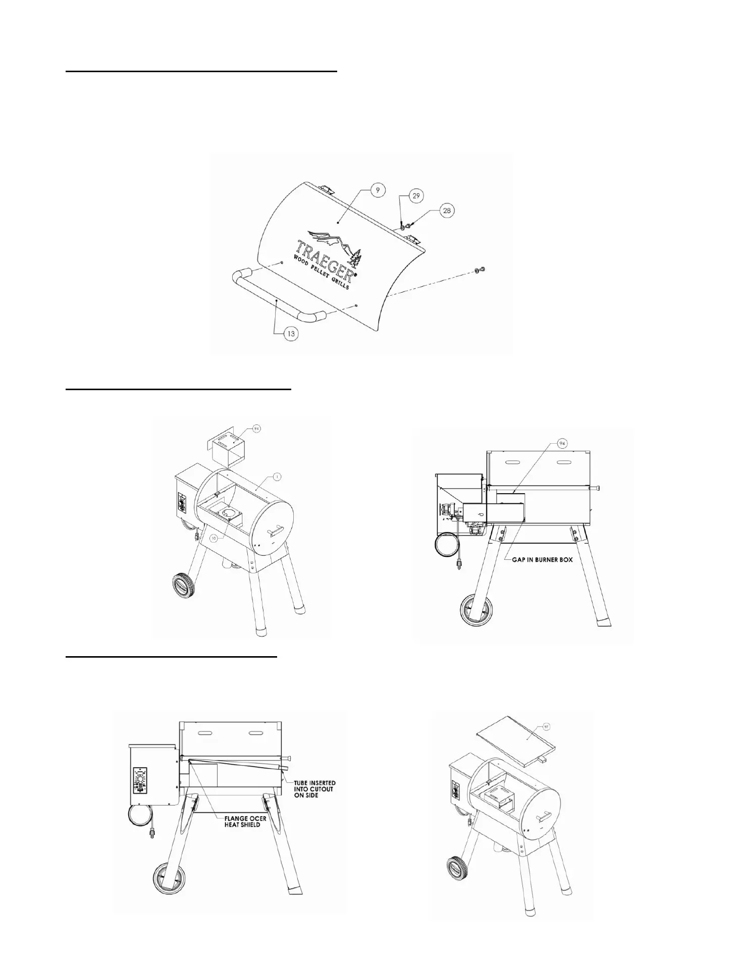 Insert the Heat Baffle (94) onto the inside of the Grill Frame Assembly (1) and place onto the