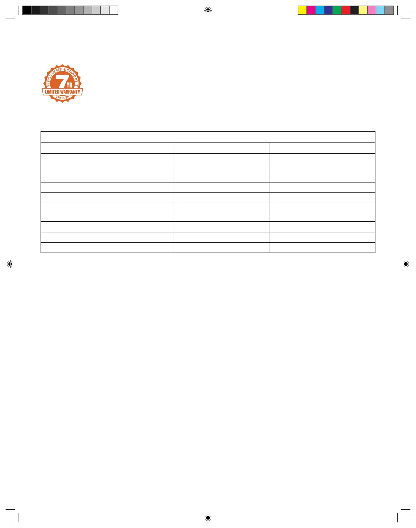 Traeger Pellet Grills LLC warrants this Traeger® Grill for the components, coverage, and warranty period listed in the table