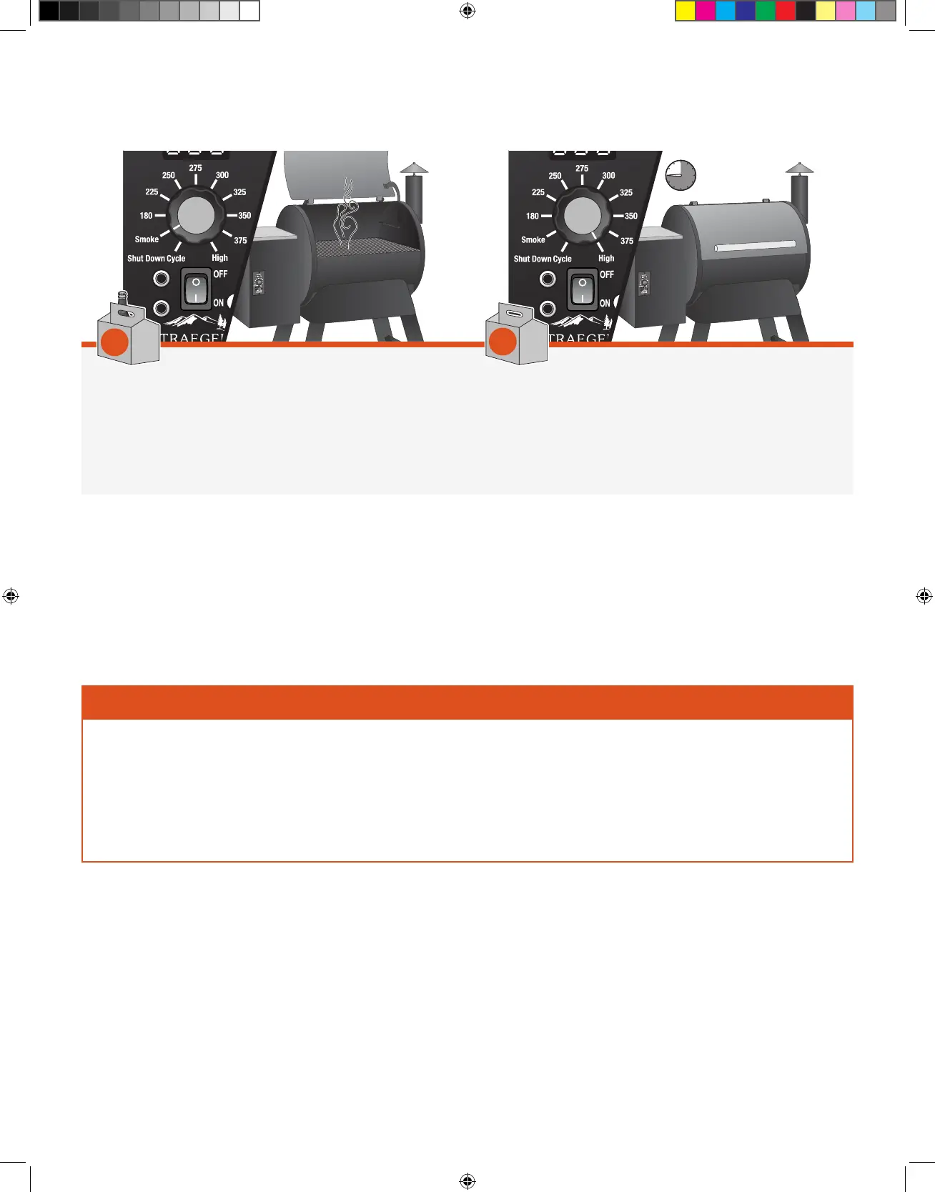 • For best results and avor, always use genuine Traeger Wood Pellets. Never use heating fuel pellets