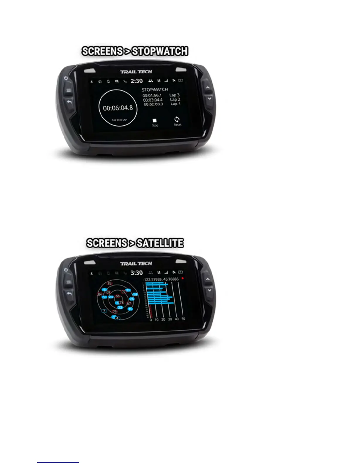 The satellite screen displays a graph of the sky and visible GPS satellites in