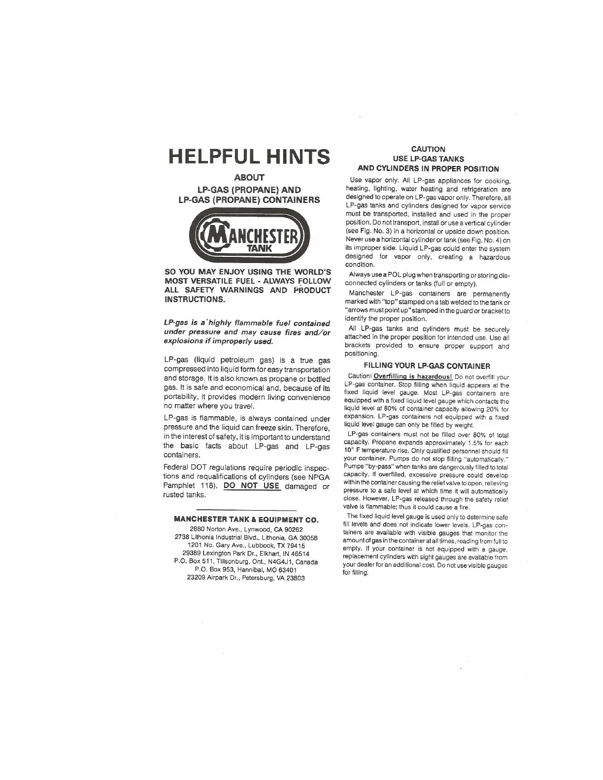TrailManor 3023 - HELPFUL HINTS ABOUT LP-GAS (PROPANE) AND LP-GAS CONTAINERS; LP-GAS TANK POSITIONING; LP-GAS CONTAINER FILLING