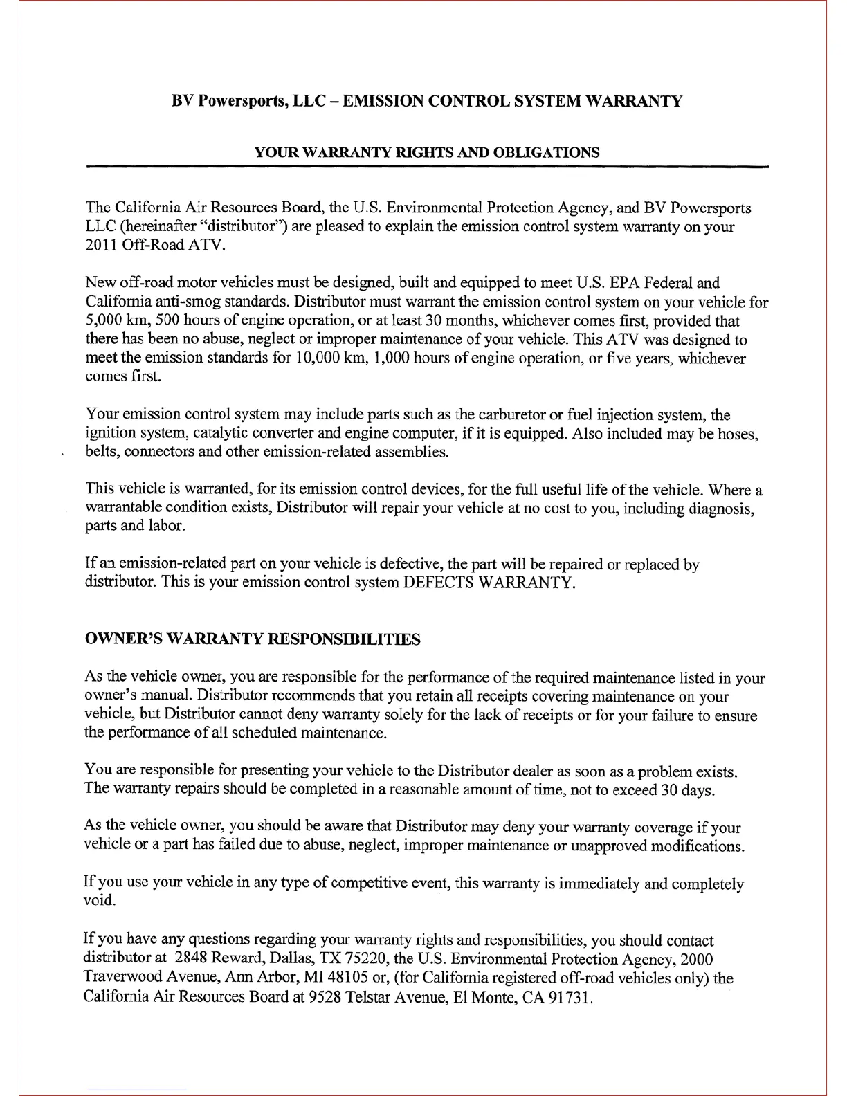 TrailMaster 300xrx - Your Warranty Rights and Obligations; Owners Warranty Responsibilities