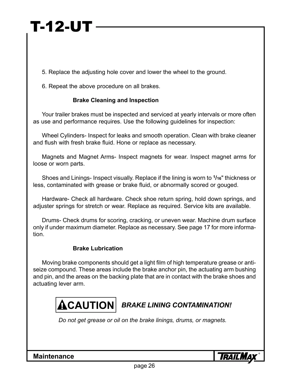 Your trailer brakes must be inspected and serviced at yearly intervals or more often