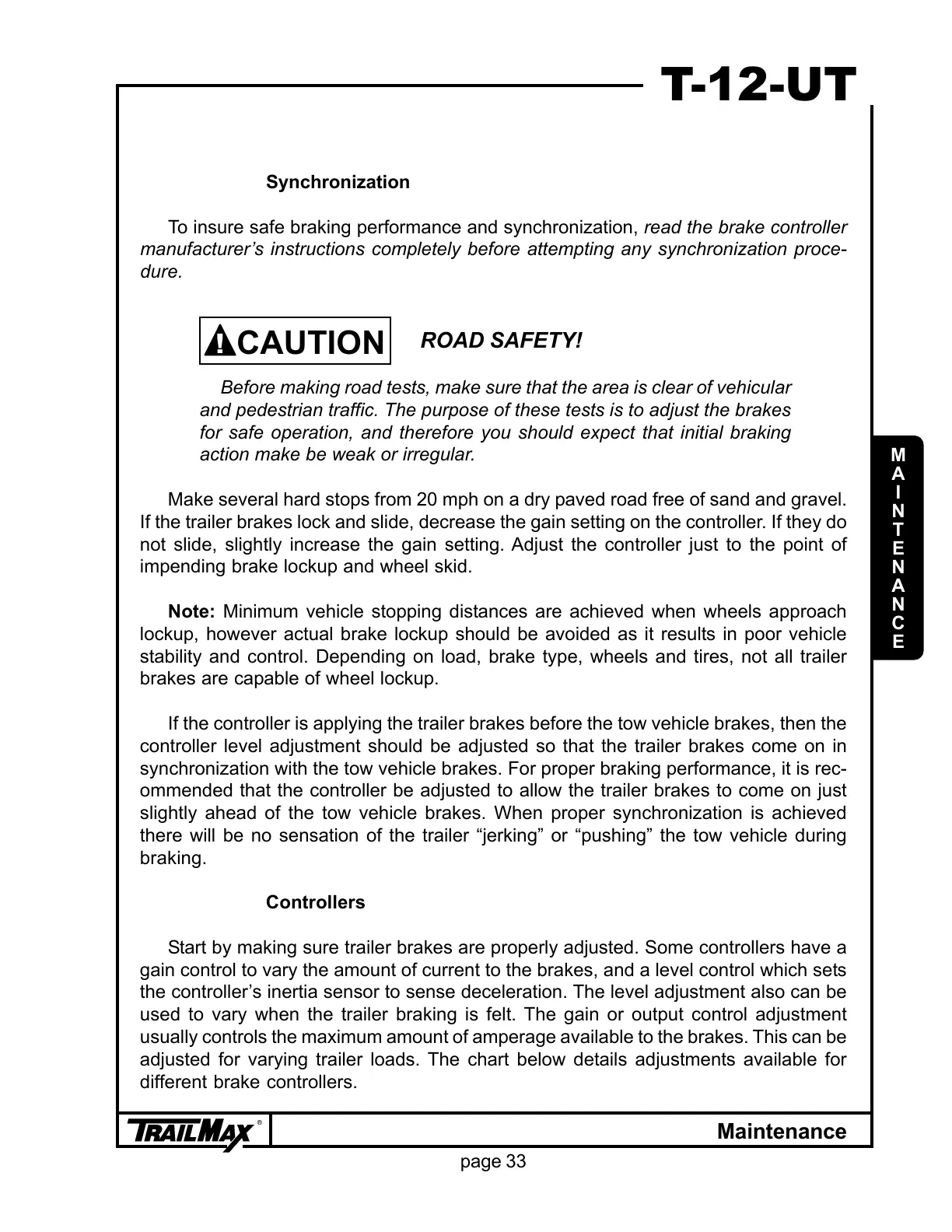 To insure safe braking performance and synchronization, read the brake controller