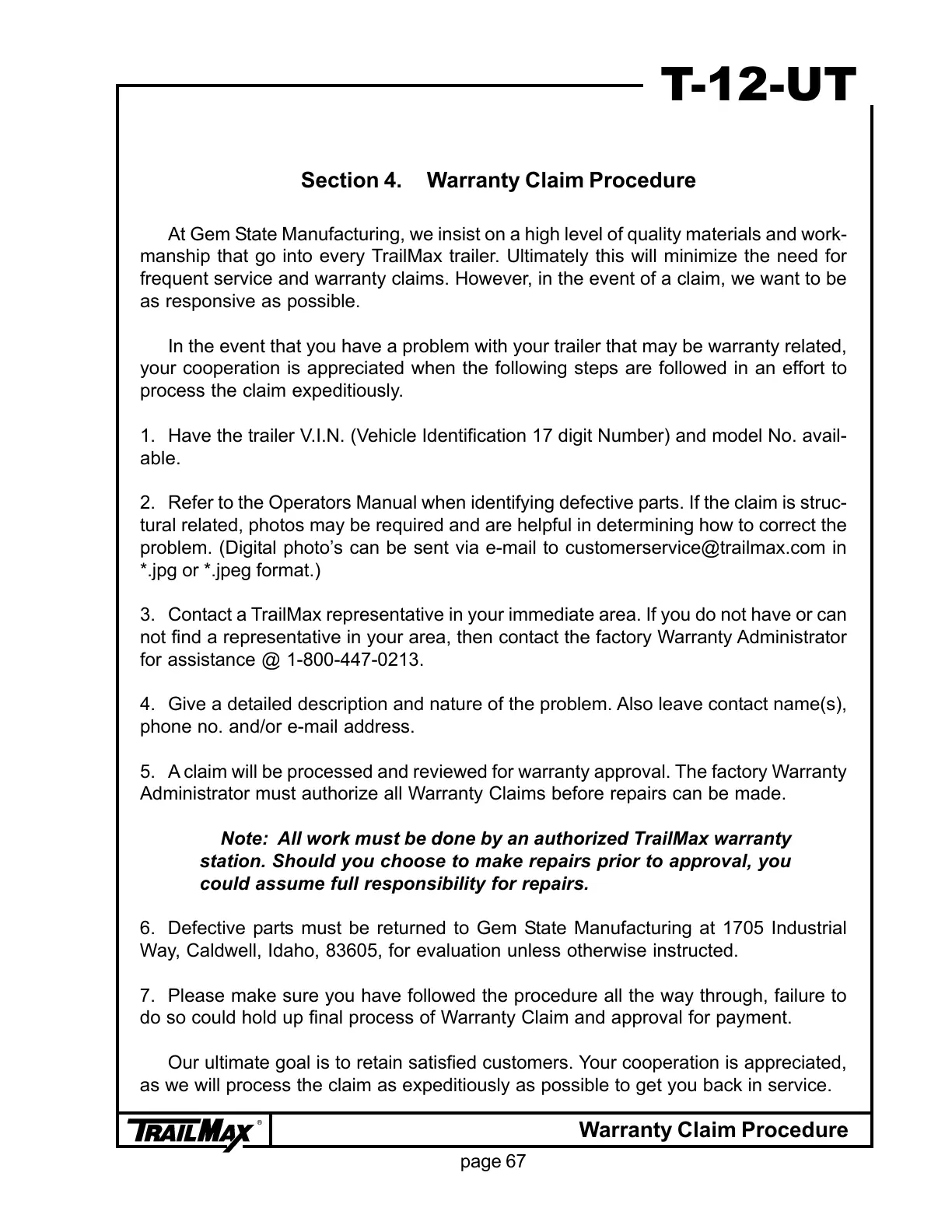In the event that you have a problem with your trailer that may be warranty related,