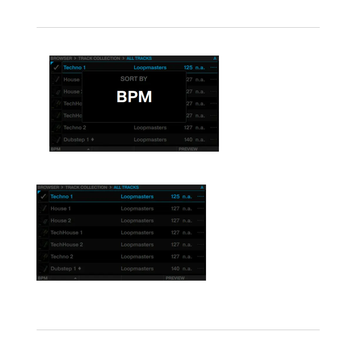Rotate Performance knob 1 until the desired category is selected in the SORT BY pop-up