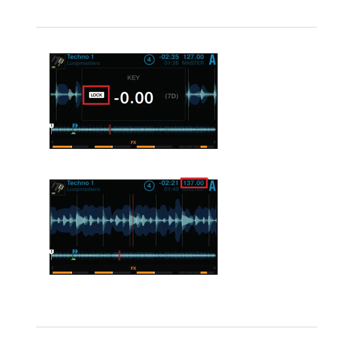 2. Press the Deck's BROWSE encoder to enable Keylock on the track. LOCK is now lit in