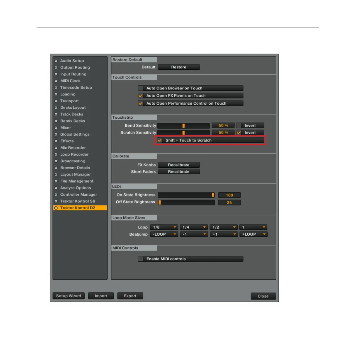 2. Navigate to the Traktor Kontrol D2 window, check the Shift + Touch to Scratch preference