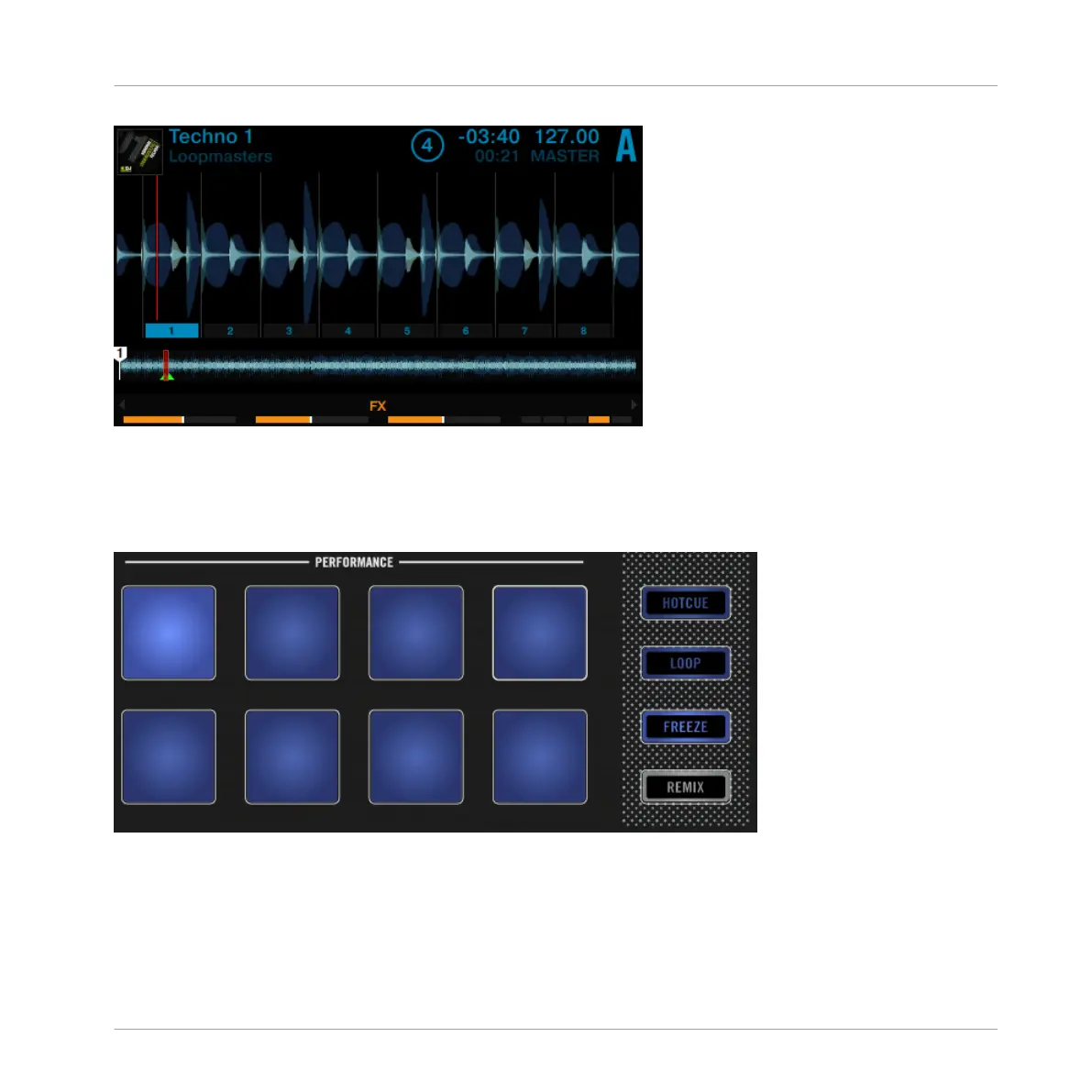 The pads are now lit blue, and the Freeze slices are shown on the track's waveform. The pad