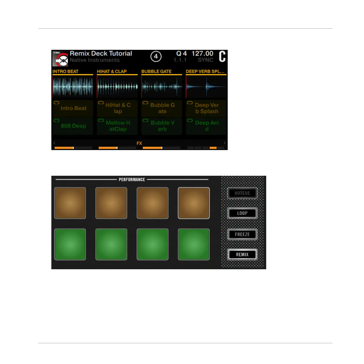 The pads now illuminate orange and green, corresponding to the Remix Deck page shown