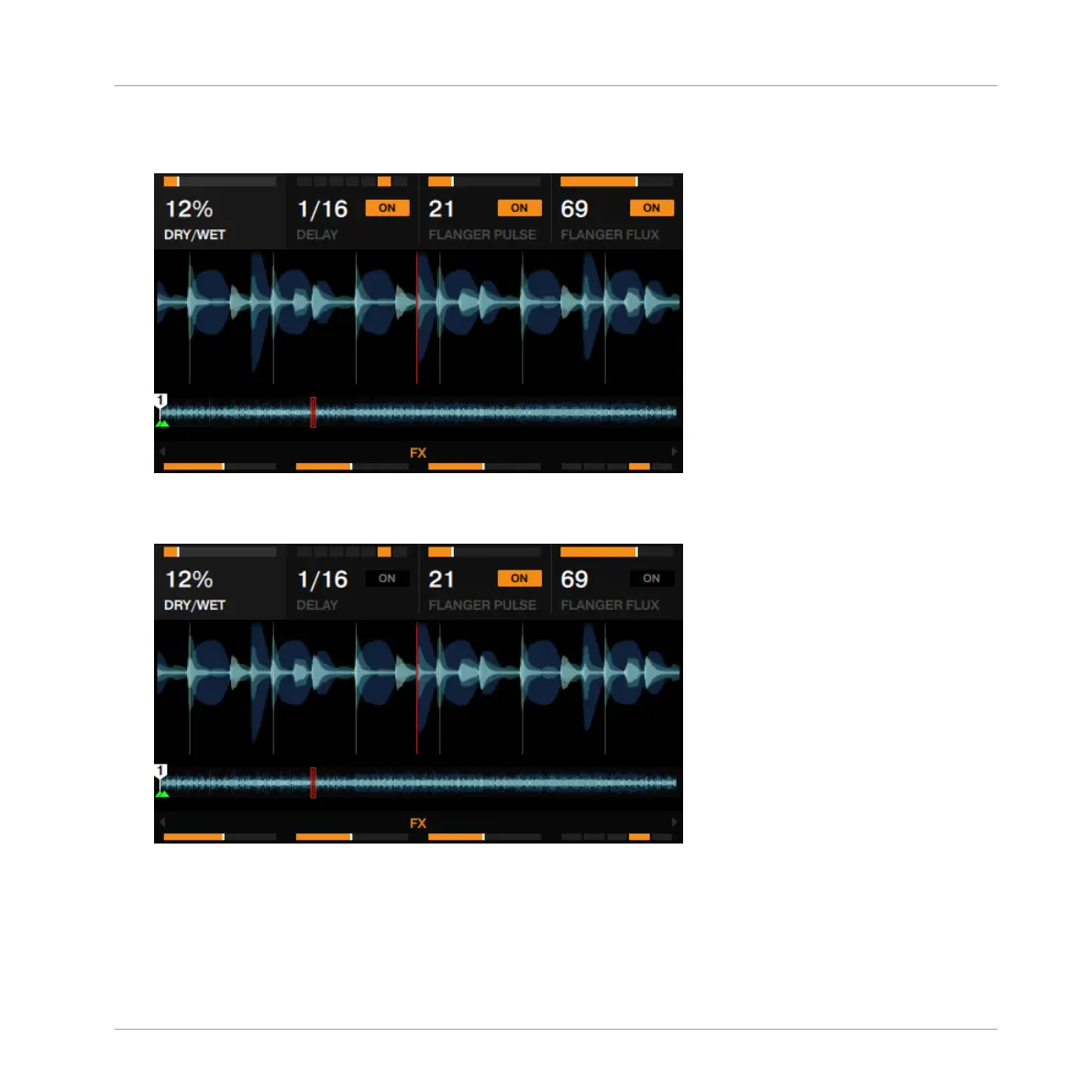 Experiment with the FX Knobs 1 to 4 and listen to the resulting changes. The parameter