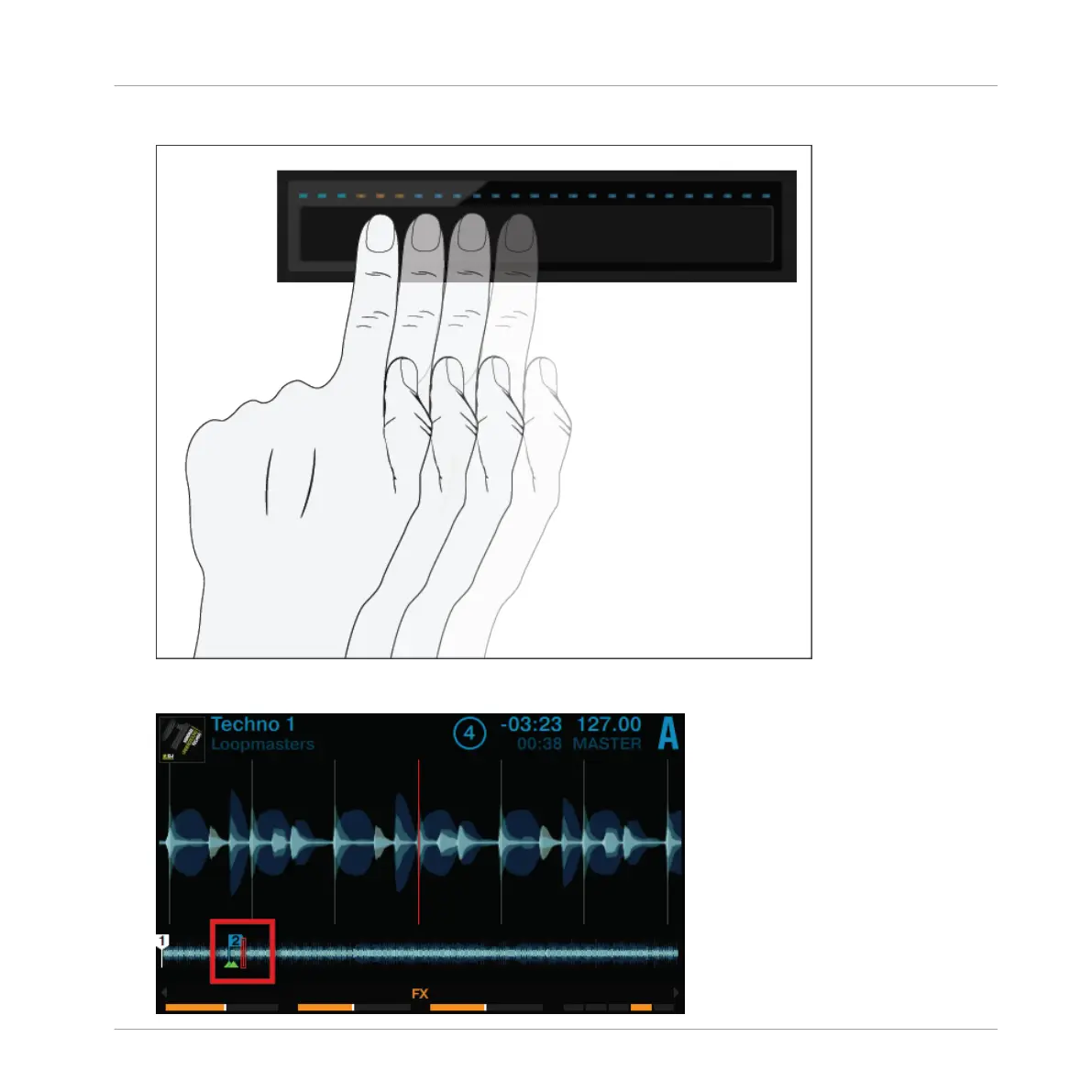 The three orange LEDs will follow your finger movement to the left, just as the Playhead