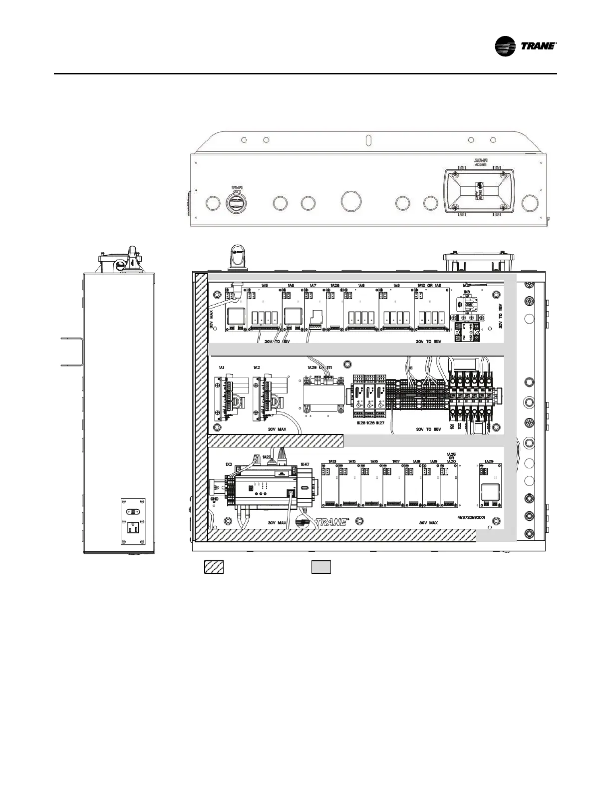 (showing low voltage and higher voltage areas for proper routing of field wiring)