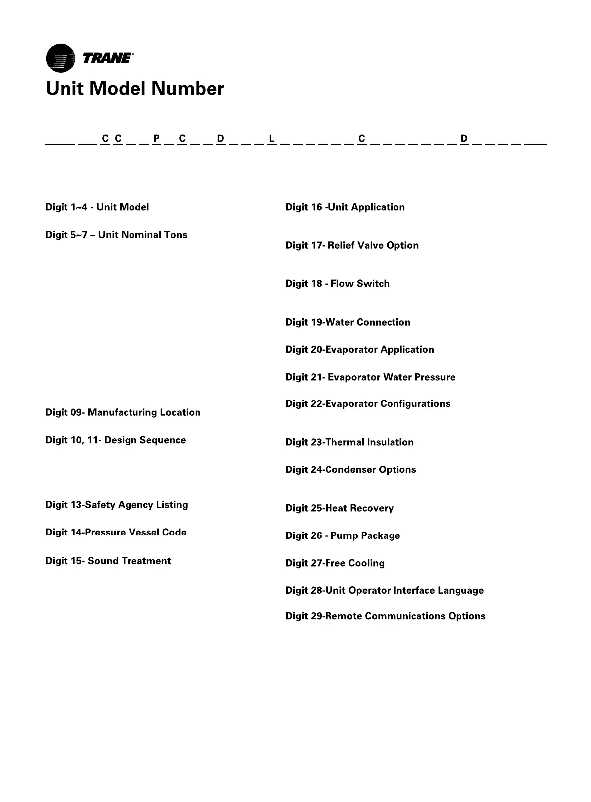 Model number digits are selected and assigned in accordance with the following definitions using the model number