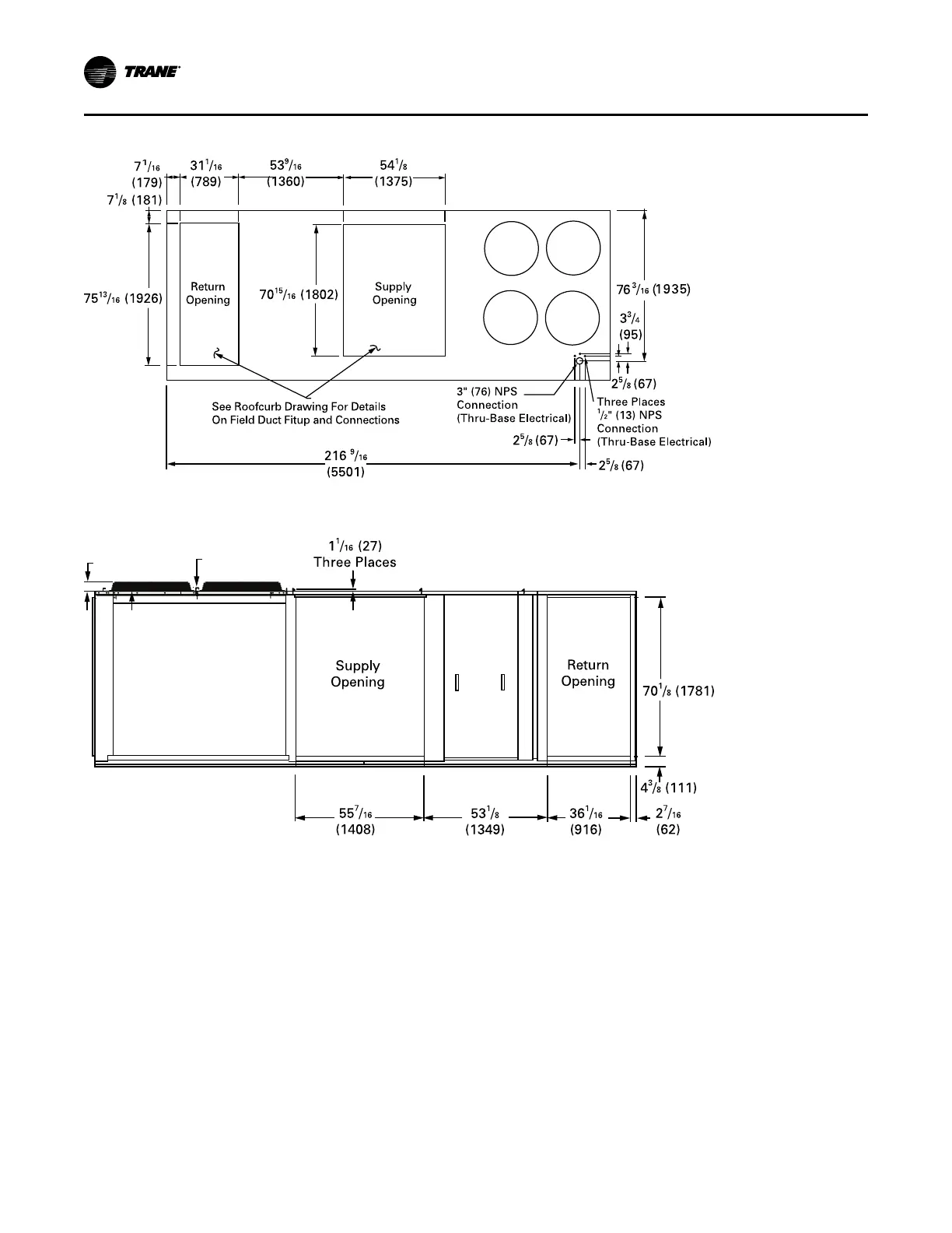 Figure 10. Rear view showing duct openings for horizontal supply and return, 60 Hz 40-50, 50Hz 33-42 Tons (TCH,