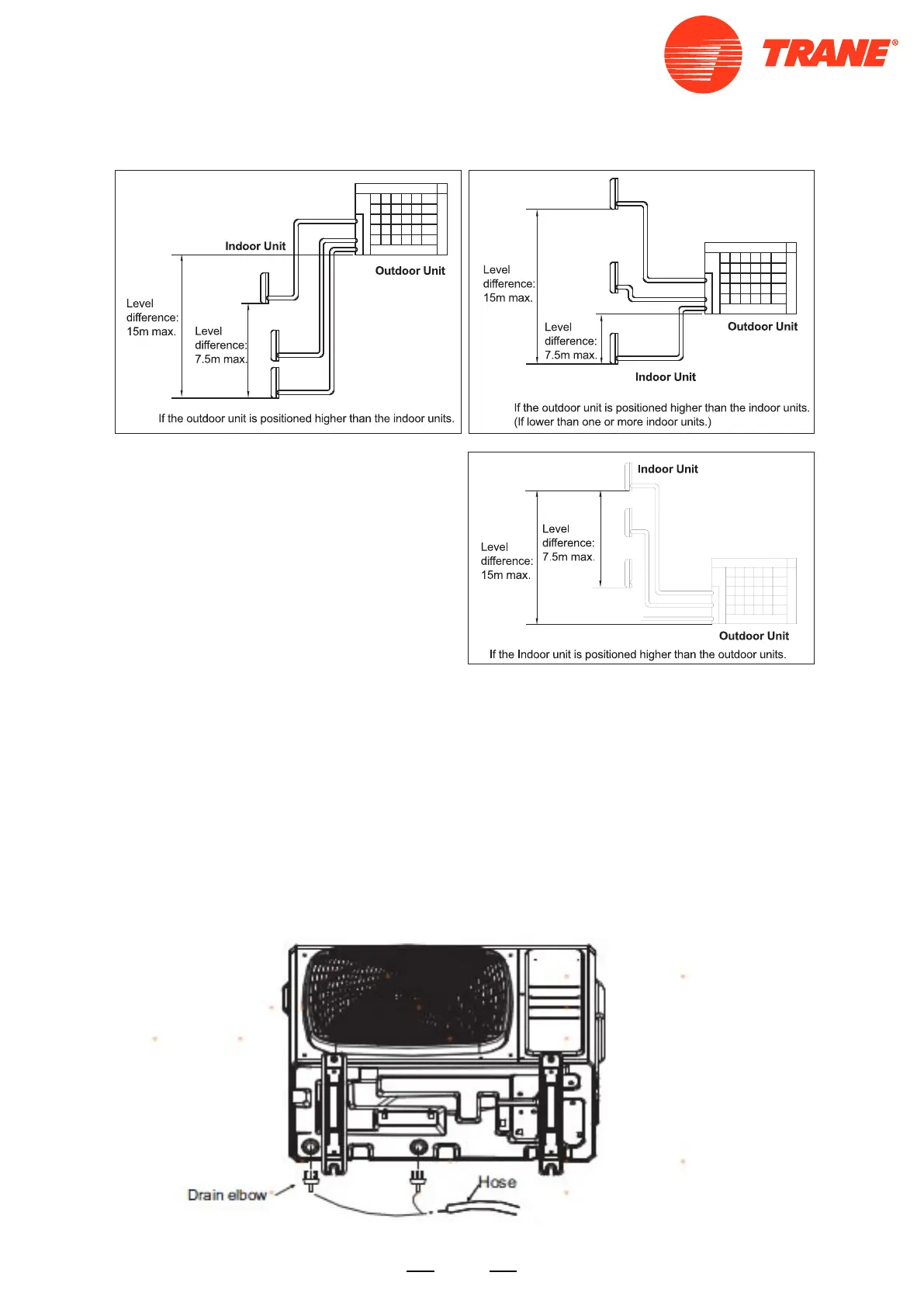 3) In cold areas, do not use a drain hose with the outdoor unit.(Otherwise, drain water may freeze, impairing