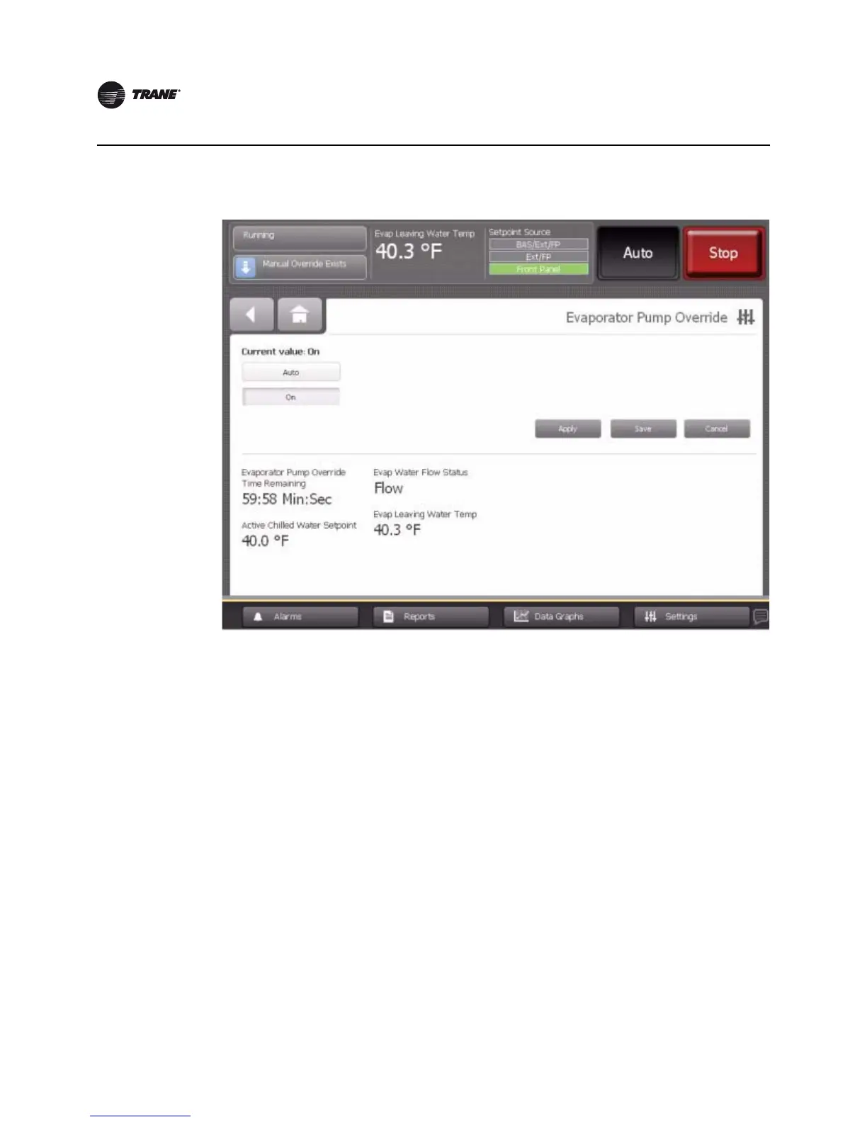 Figure 25. Manual Control Settings screen (Evaporator Pump Override shown)