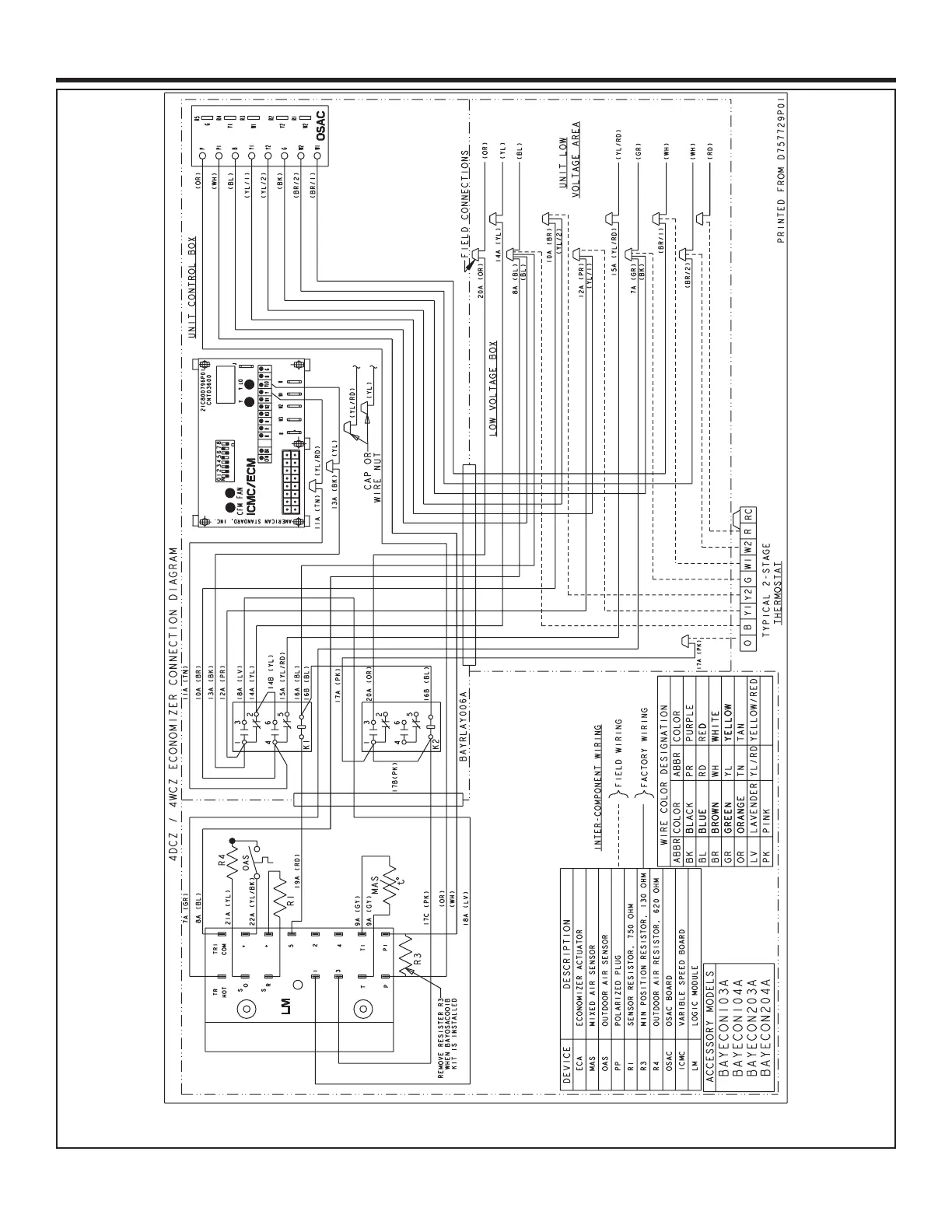 Trane BAYRLAY006A - 4 WCZ6 & 4 DCZ6 Economizer Connection Diagram (W7459)