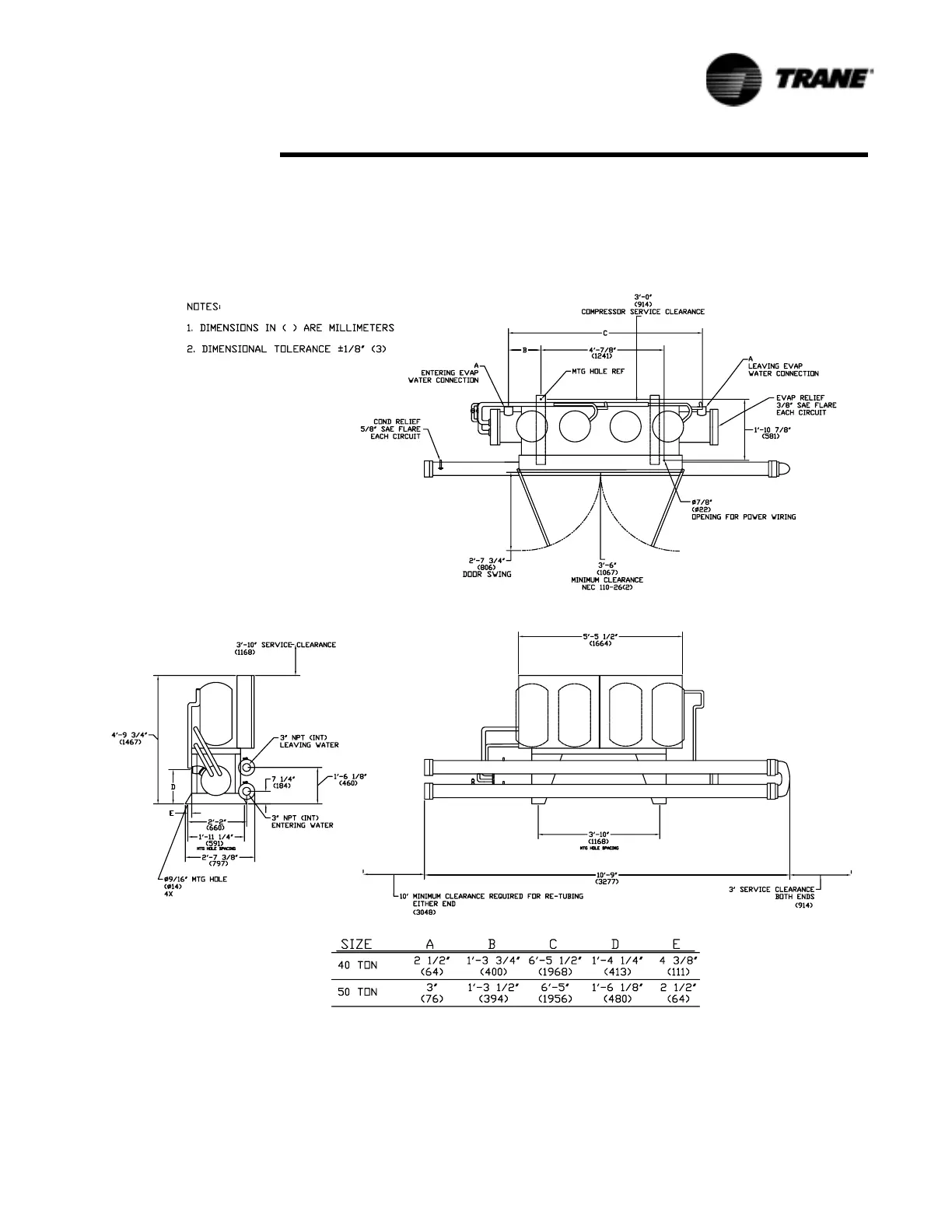Figure 8 CGWF 40 and 50 Ton Unit Dimensions, Recommended Clearances, Mounting Locations,