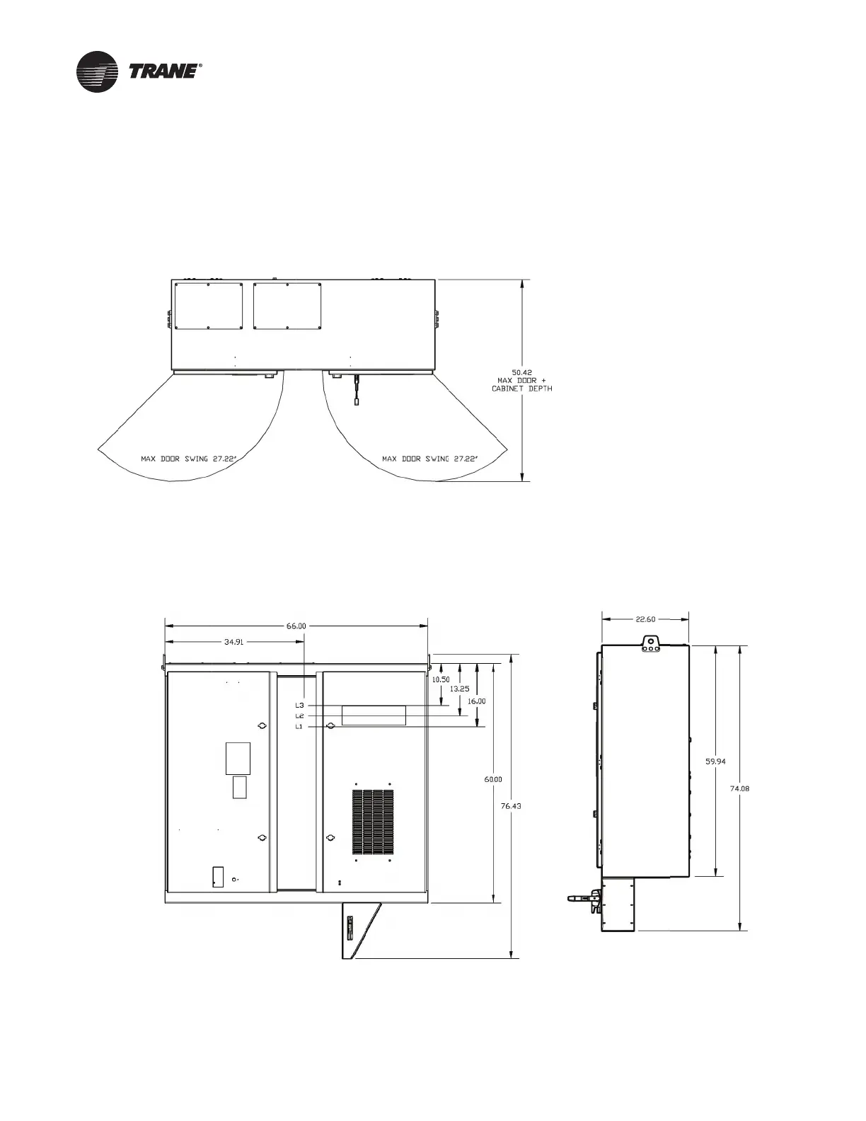Figure 14. Top, front, and side view of E-Frame AFDH cabinet with dimensions - Direct mount drive