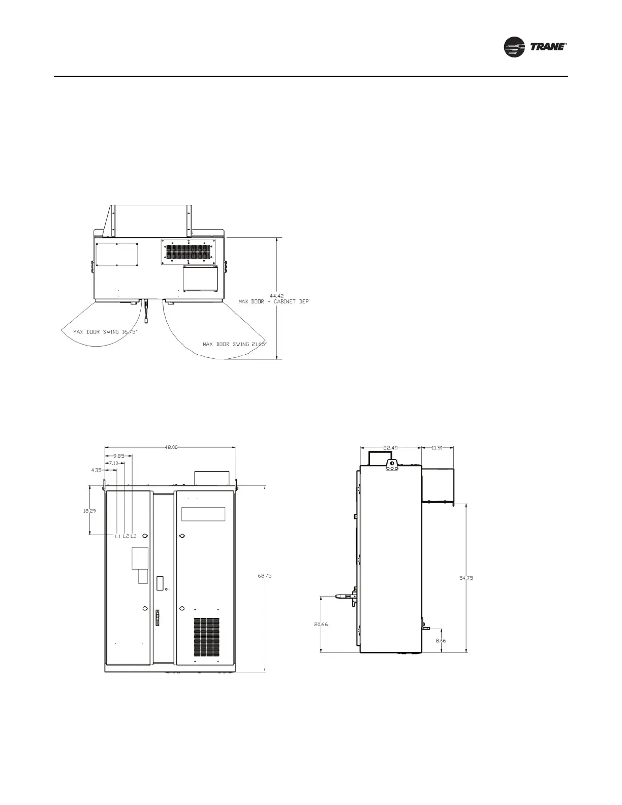 Figure 15. Top, front, and side view of E-Frame AFDH cabinet with dimensions - Transition mount drive