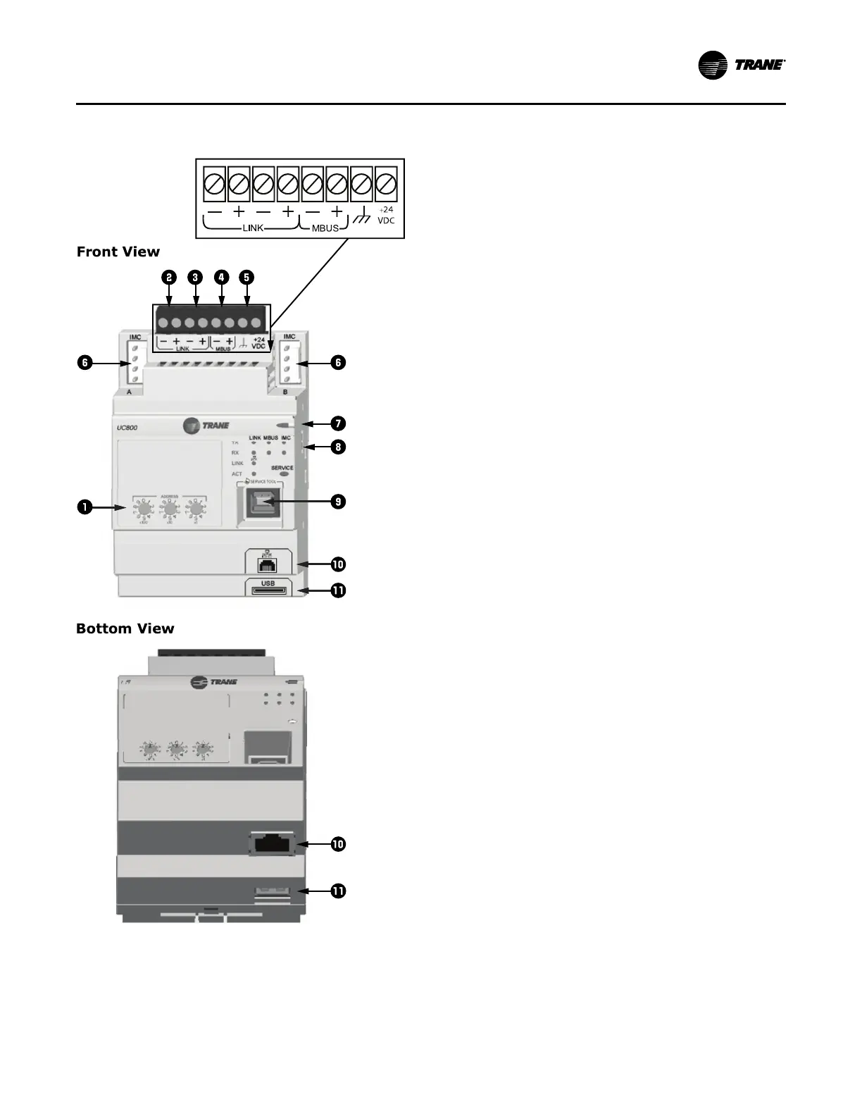 8. Status LEDs for the BAS link, MBus link, and IMC
