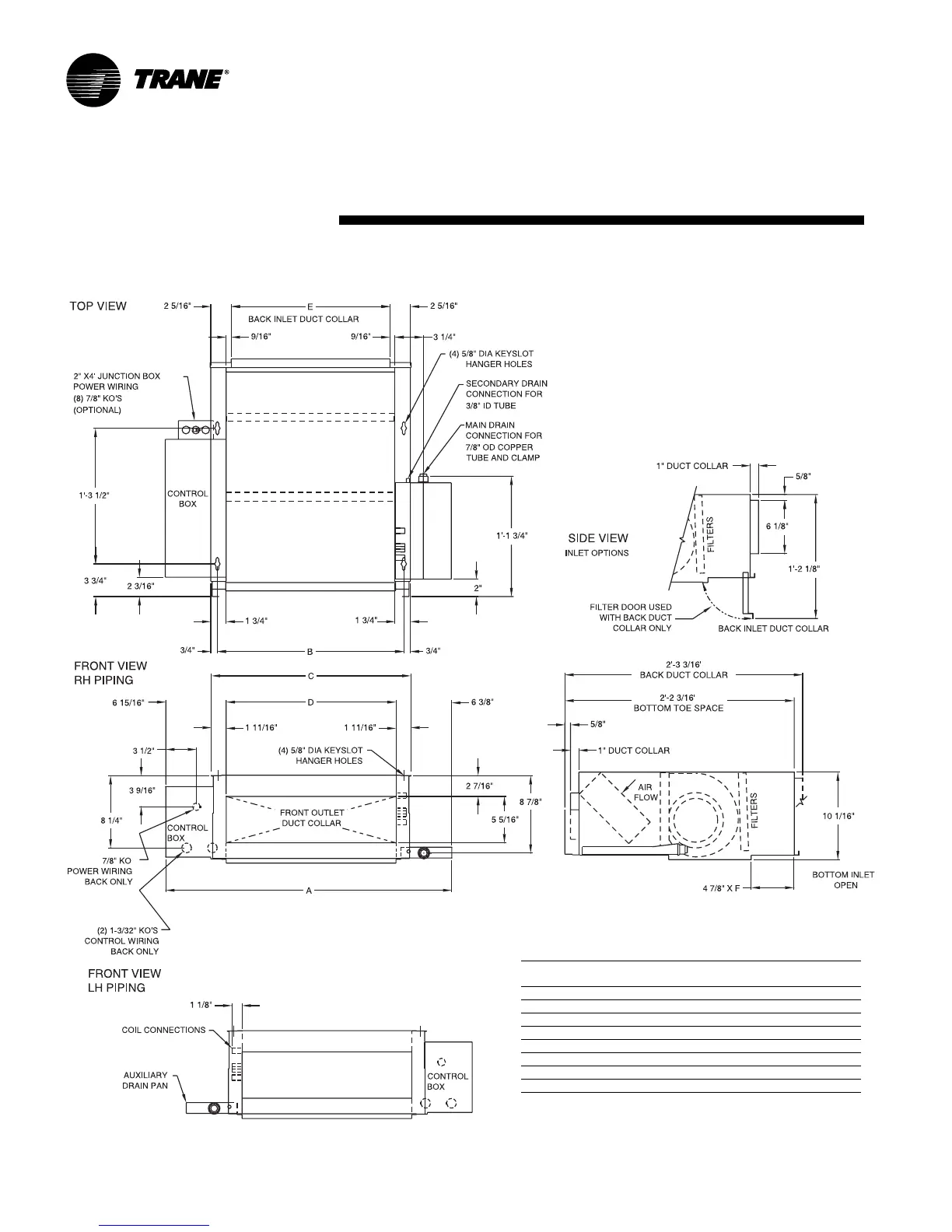 Horizontal Concealed Unit Dimensions, in-lbs.