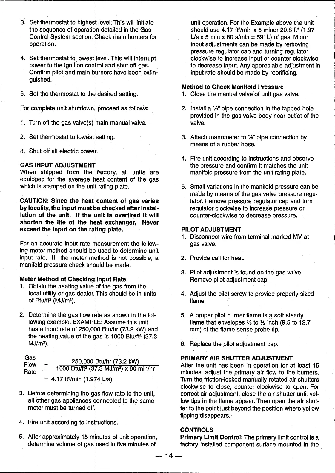 Trane GRAA - Gas Input Adjustment; Pilot Adjustment; Primary Air Shutter Adjustment; Controls
