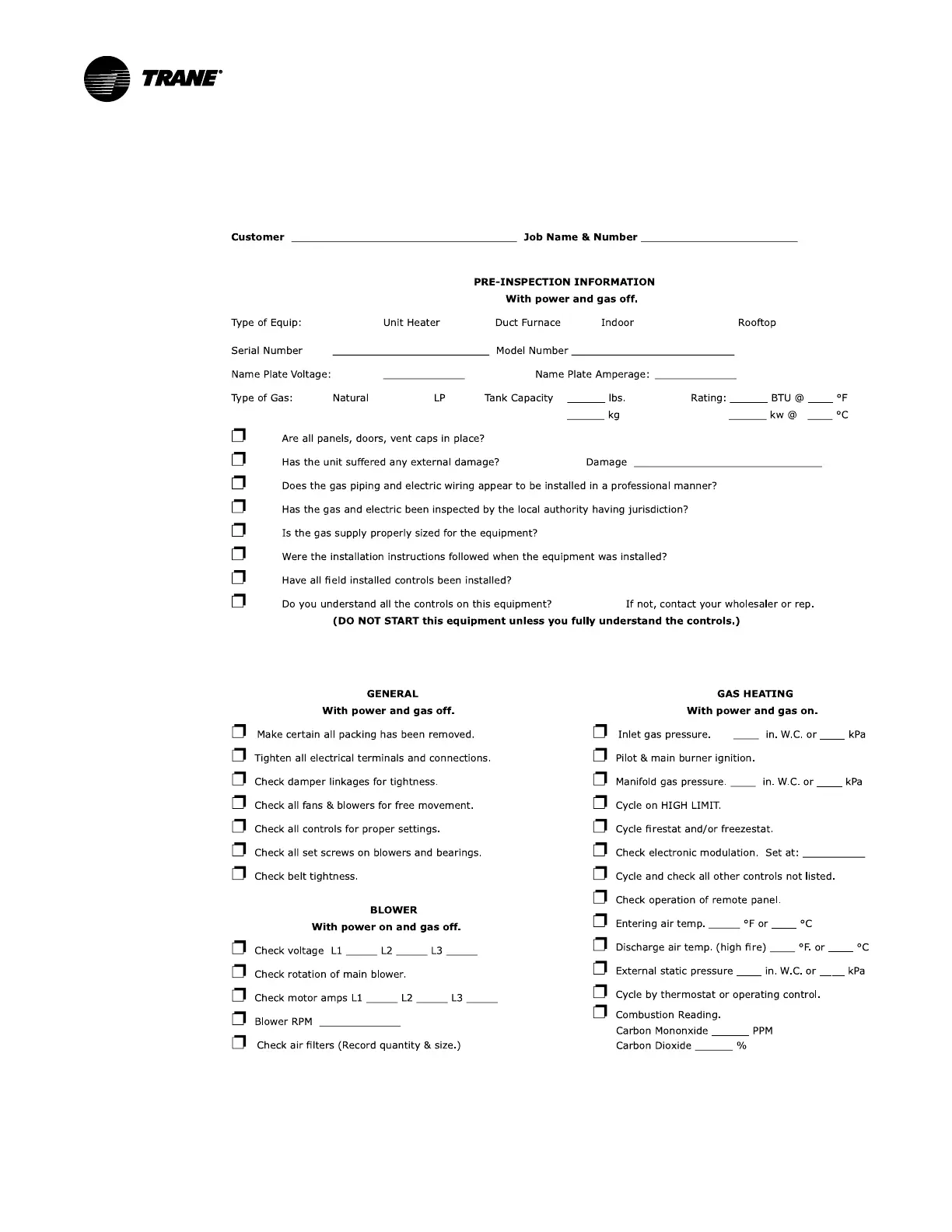 Trane GRAA - Gas Equipment Start-Up; Pre-Inspection and General Checks; Gas Heating and Blower Checks