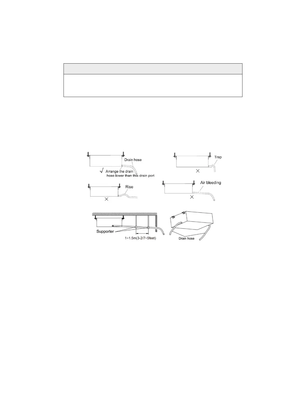 1. Keep piping as short as possible and install the drain hose with downward gradient (1/50 to