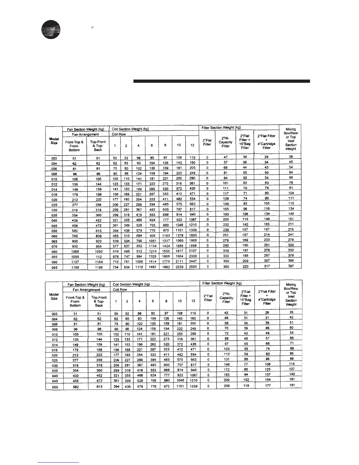 Fan + Coil + Filter and Mixing Sections (without motor weight)