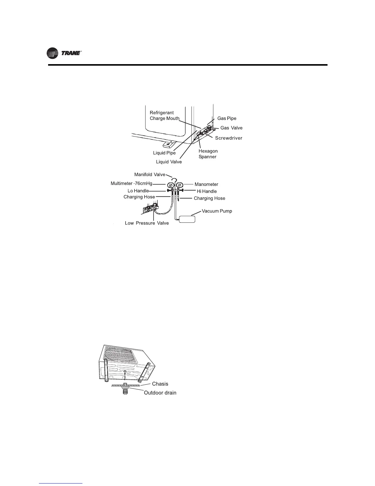 Install the outdoor drai a 25mm hole on the base plate, and joint the drain hose to the