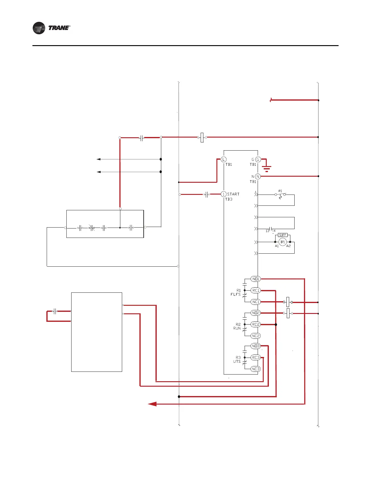 Figure 9. Control power wiring (new wiring bold/highlighted in red) — RTHA (MX2 starter)