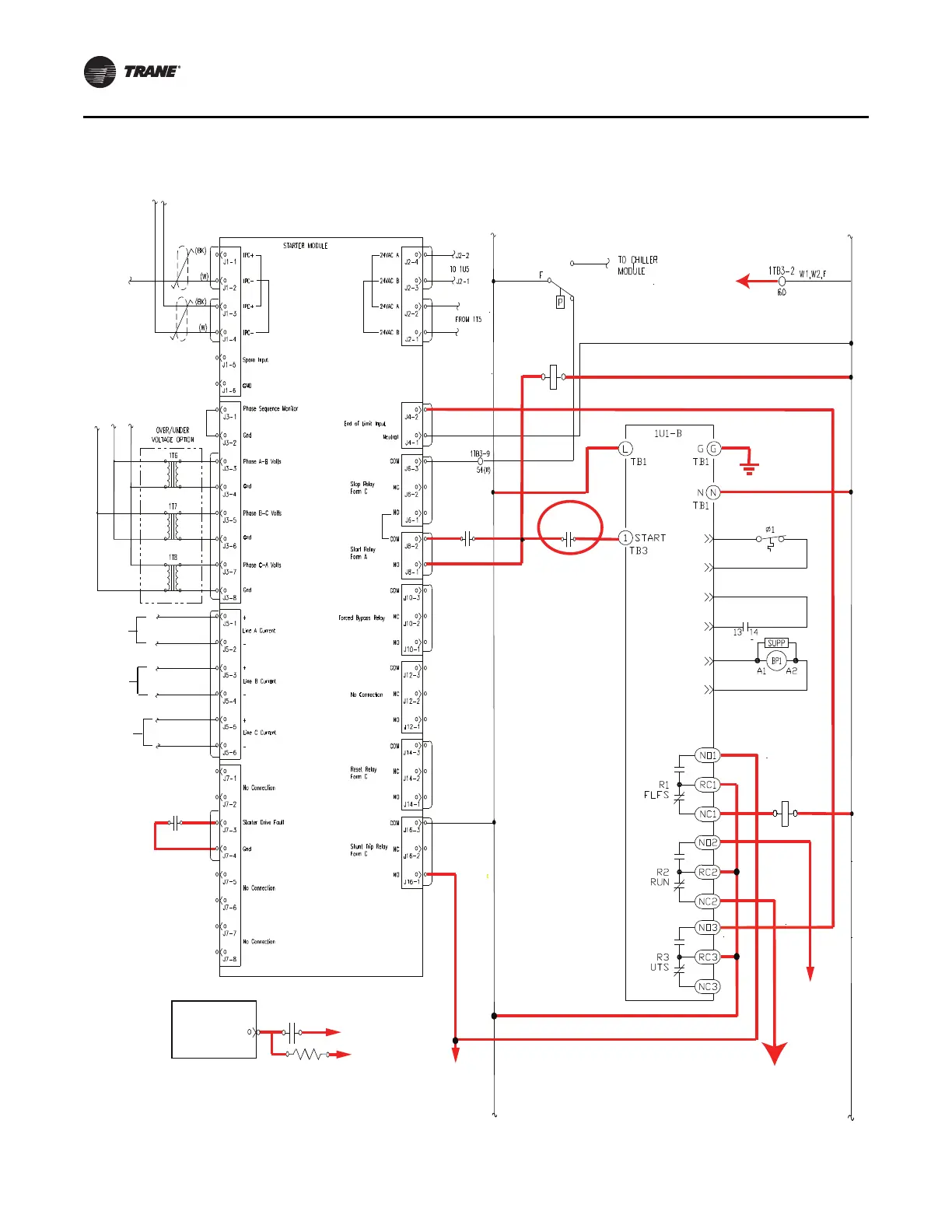 Figure 22. Control power wiring (new wiring bold/highlighted in red) — RTHC(MX2 Starter)