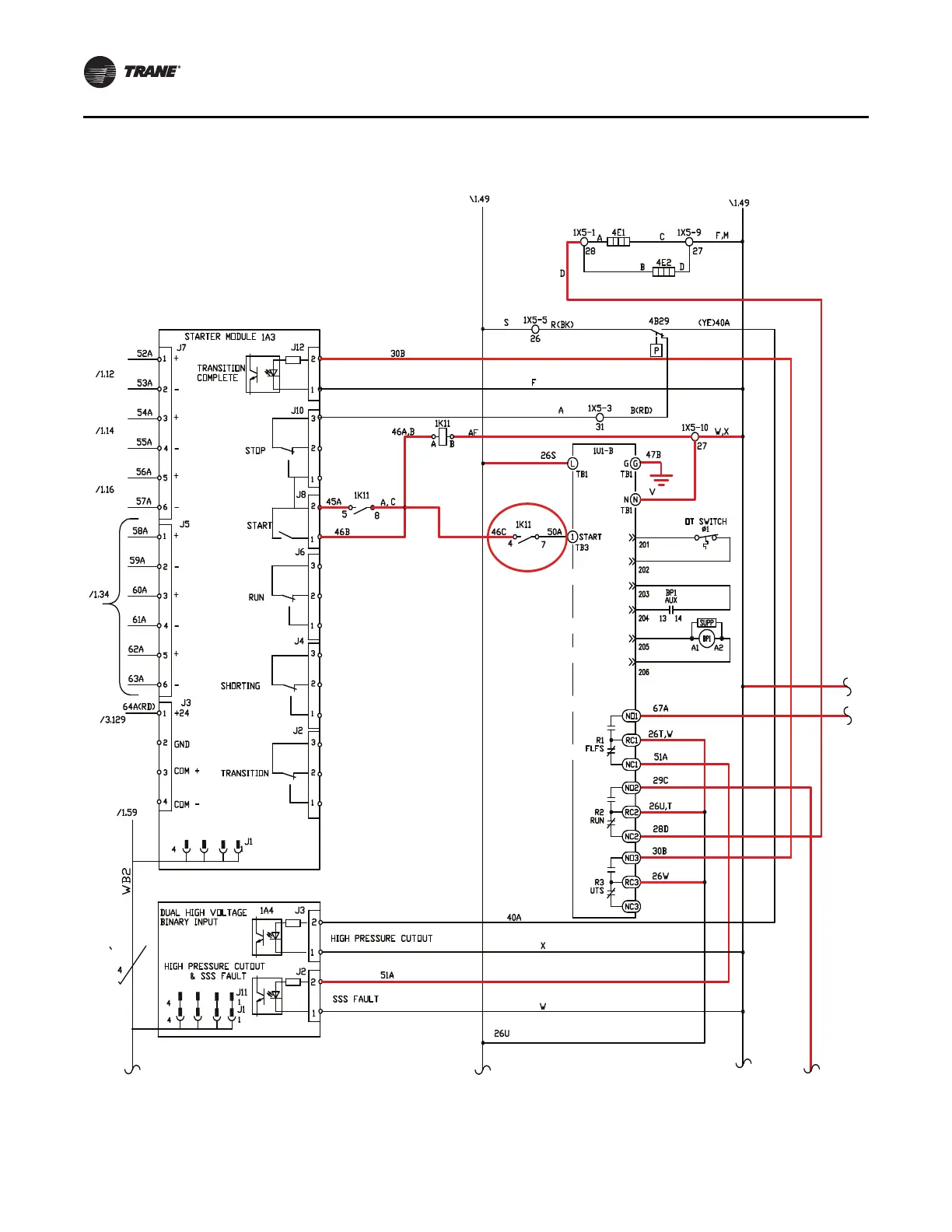 Figure 35. Control power wiring (new wiring bold/highlighted in red) — RTHD - MX2 Starter