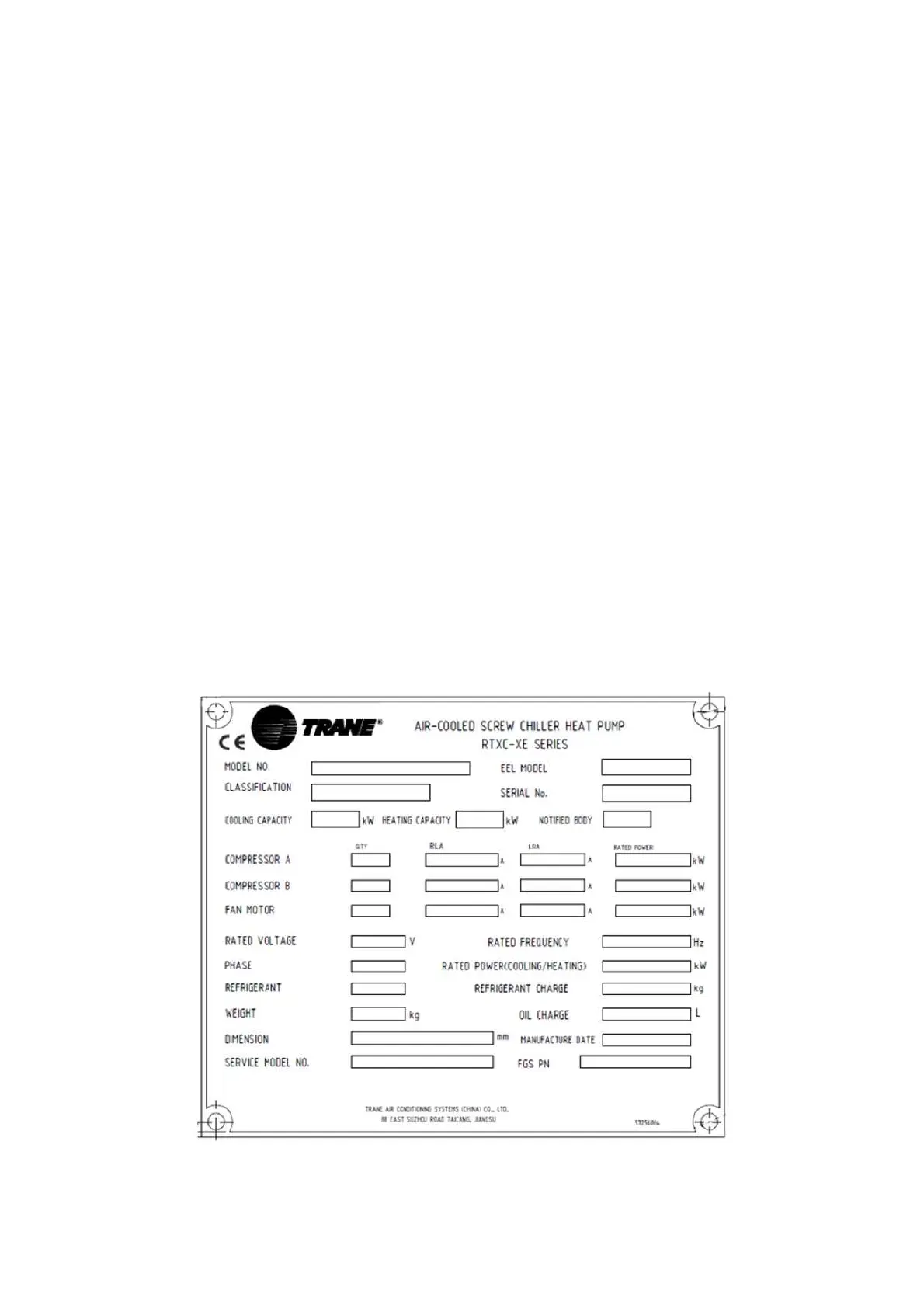 The RTXC XE unit nameplates are applied to the exterior surface of the top cover above the control panel