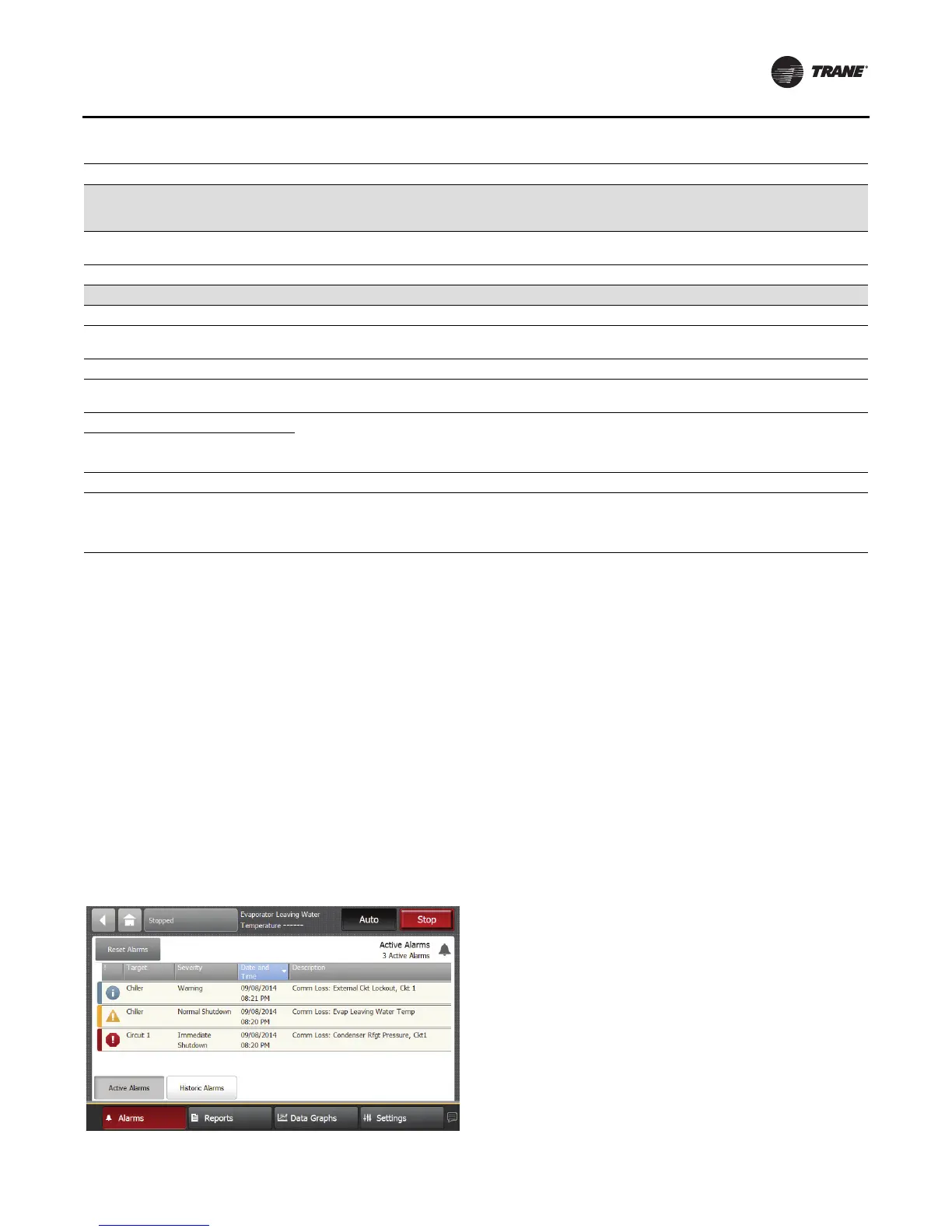 p. 37) to view the Alarms screen. A table of active alarms