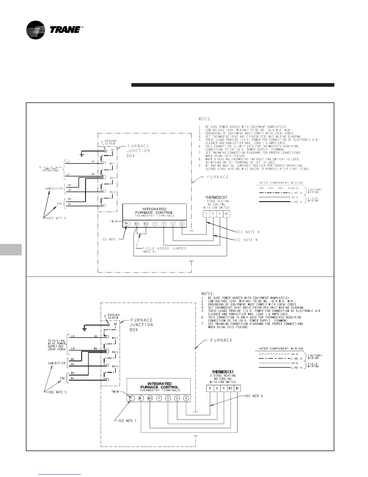 Trane TDX080R942V - Field Wiring Diagrams; Single Stage Heating Wiring; 2 Stage Heating Thermostat Wiring