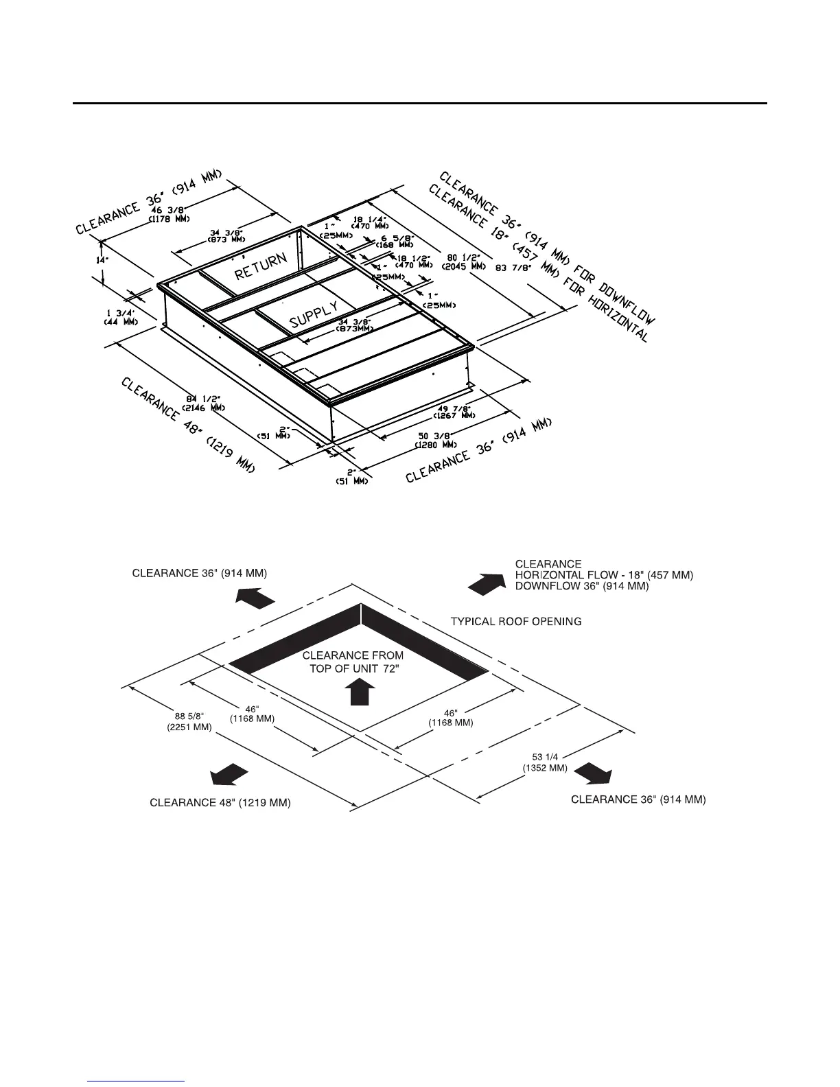 Figure 7. 6, 7½ (single) ton standard efficiency,4-5tonhigh efficiency - unit clearance and roof opening